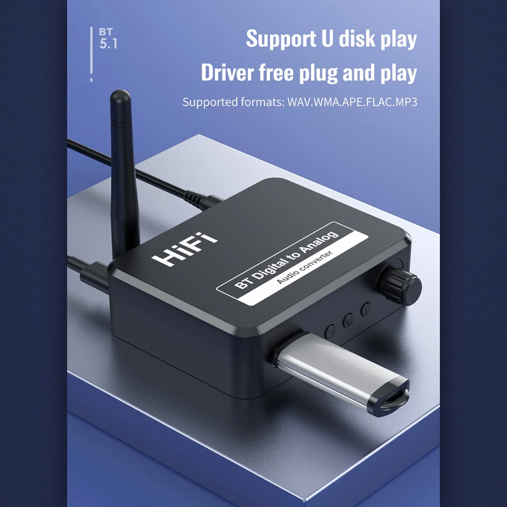 Usb-порт: Этот беспроводной цифровой в аналоговый аудиоадаптер поддерживает u-диск и может воспроизводить музыку в форматах WAV, WMA, APE, FLAC, MP3.