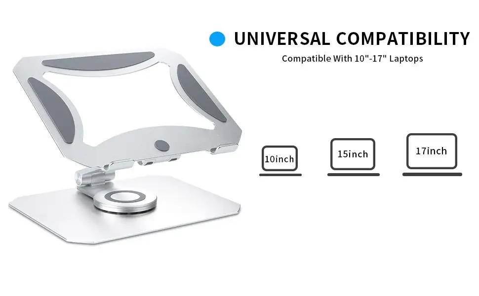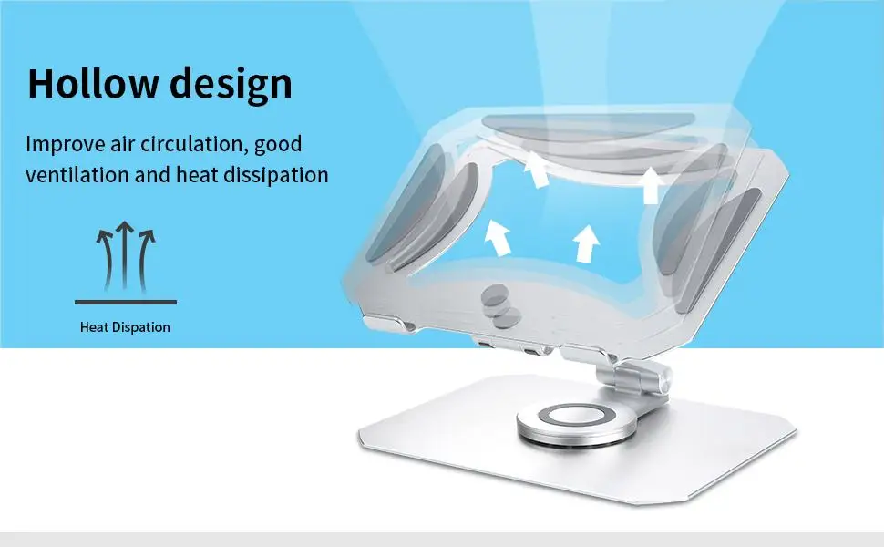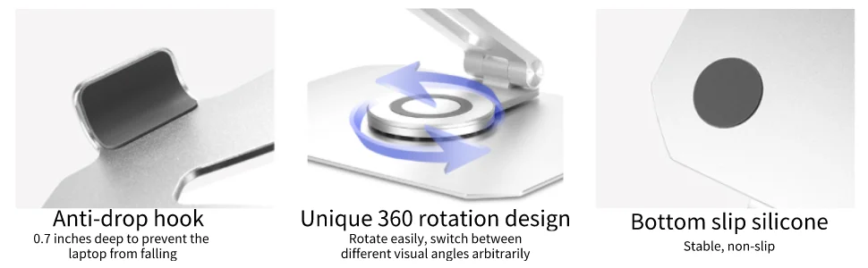 【Stable & protective】вращающаяся подставка для ноутбука изготовлена из утолщенного алюминиевого сплава, имеет гладкий край, который защищает вас от царапин. Обеспечивает прочную и прочную силиконовую прокладку, чтобы обеспечить плотное соединение с столом и удерживать ваш ноутбук на месте, не беспокойтесь о том, что вы не ускользаете.