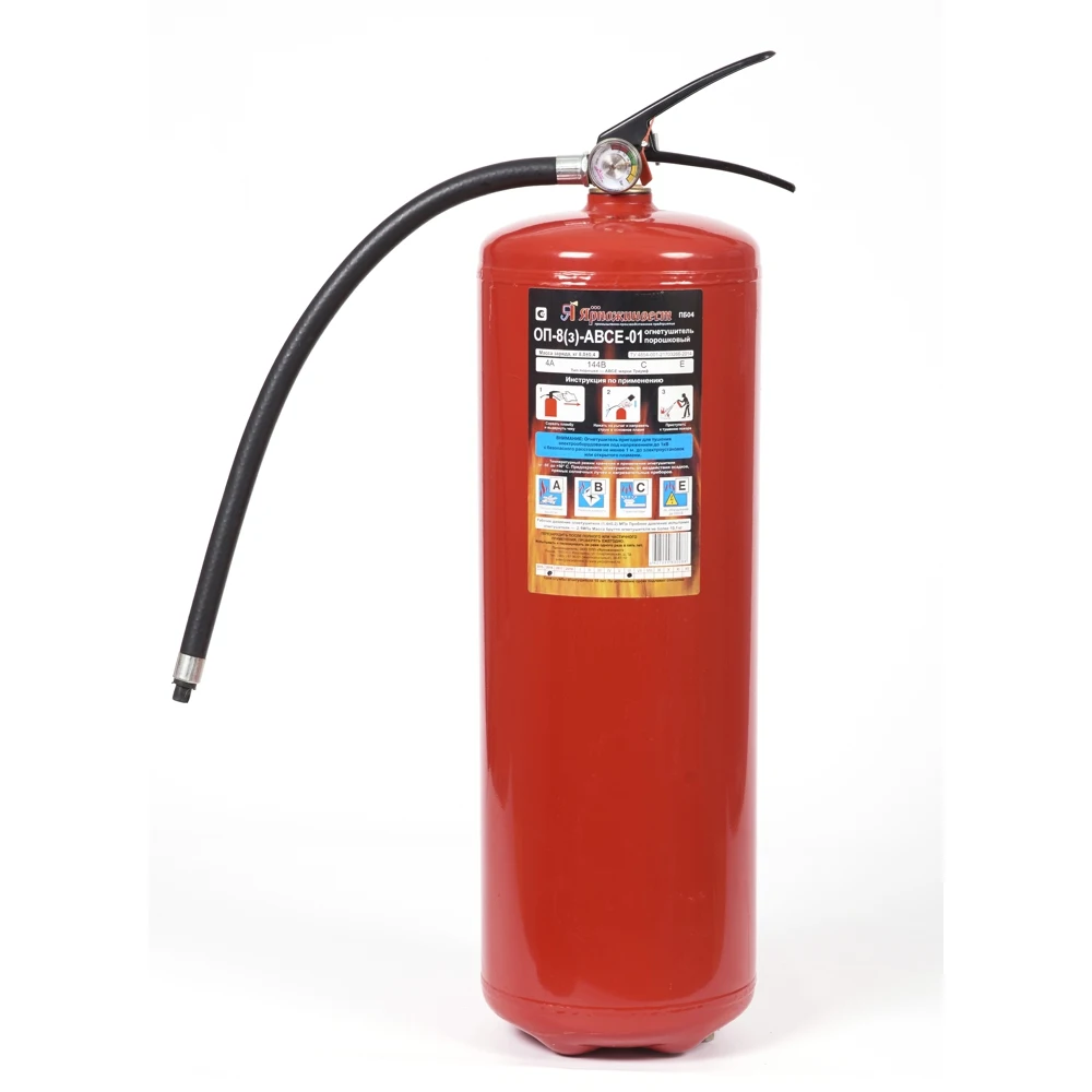 Огнетушитель порошковый ОП-8 Ярпожинвест (г. Ярославль) - универсальный переносной огнетушитель закачного типа.Масса заряда огнетушащего вещества - 8 кг. Ранг по модельным очагам: 4А, 144В, С, Е (до 1000В).