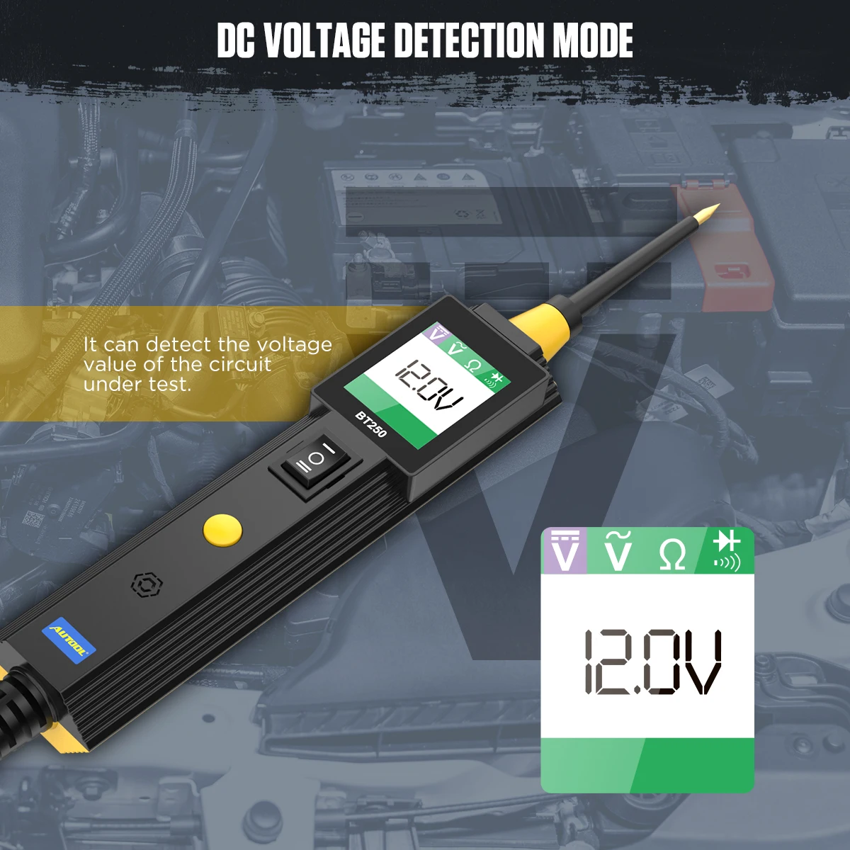Автомобильный тестер электрической цепи AUTOOL BT260 подходит для диагностики всех электрических систем транспортного средства с напряжением от 6 до 30 В. С простым подключением инструмента к батарее транспортного средства, Обнаружение напряжения переменного тока, Обнаружение напряжения постоянного тока, обнаружение сопротивления, тест диода и защита от перегрузки по току будут доступны для тестирования.