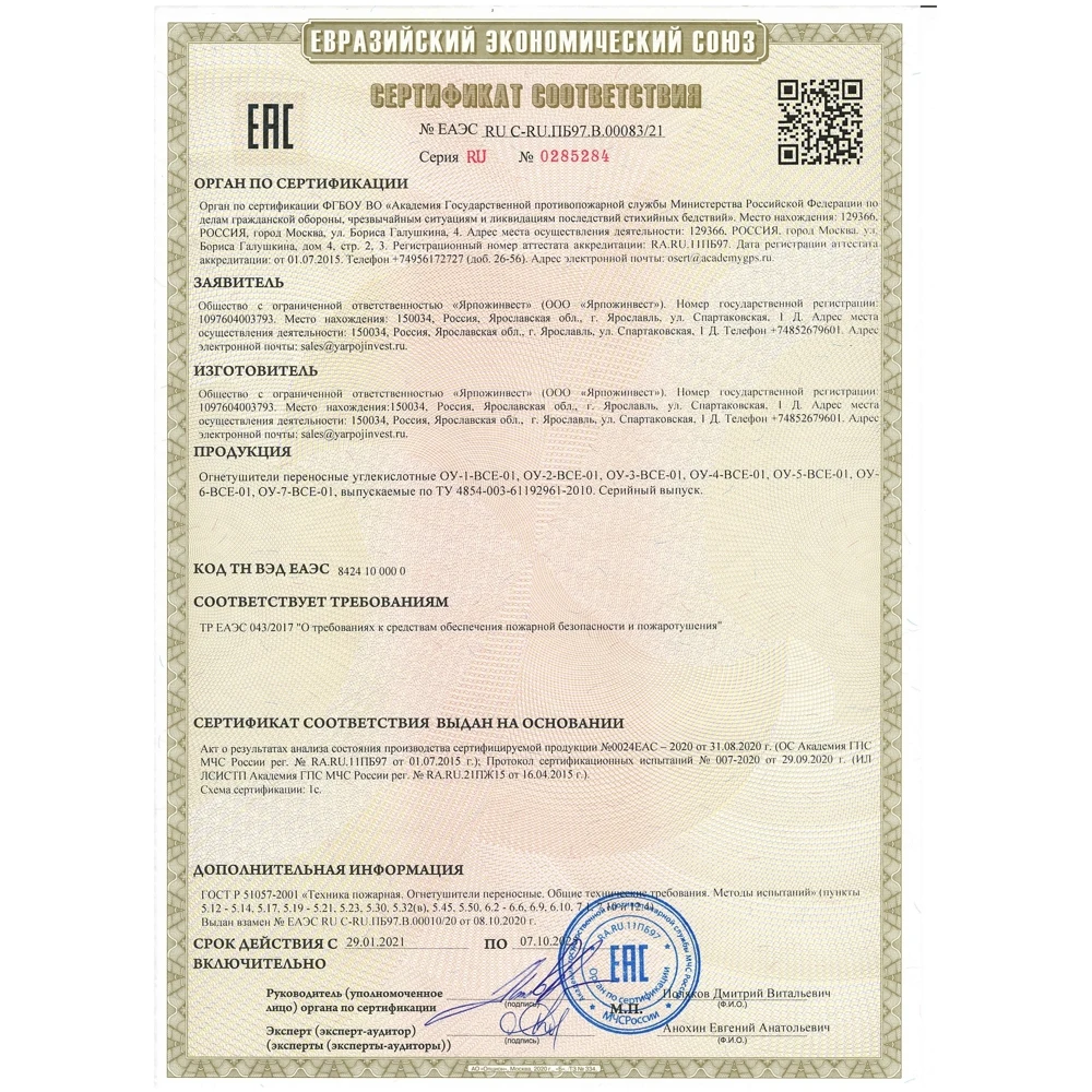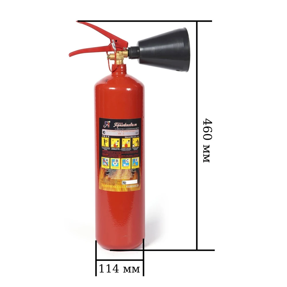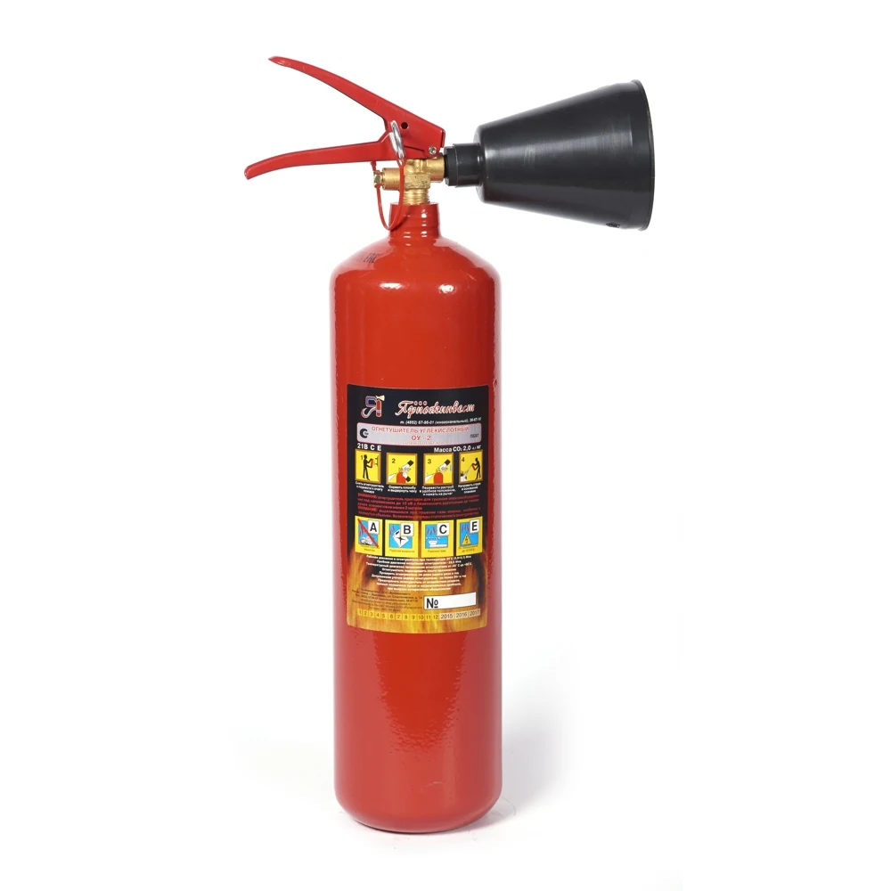 Описание Углекислотный автомобильный огнетушительОгнетушитель углекислотный ОУ-2 Ярпожинвест (г. Ярославль) - универсальный переносной огнетушитель.Масса заряда огнетушащего вещества - 2 кг. Ранг по модельным очагам: 21В, С, Е (до 10000В).Углекислотный огнетушитель предназначен для быстрого охлаждения поверхности и рассеивания газа. Благодаря действию диоксида углерода материальные ценности практически не разрушаются, на них не остается разводов и пятен. Возгорание прекращается за счет охлаждения области горения. Огнетушитель особенно эффективен для локализации пожара на начальной стадии и тех видов возгорания, где запрещено применение воды.Углекислотный огнетушитель ОУ-2 предназначен для тушения веществ, горение которых не может происходить без доступа воздуха:В - горючие жидкости;С - горючие газы;Е - электрооборудование под напряжением до 10000 В.Огнетушитель ОУ-2 не предназначен для тушения твердых веществ (класс А), а также для локализации возгораний металлов и прочих материалов, способных гореть без доступа воздуха.Углекислотный огнетушитель ОУ-2 рекомендуется для оснащения:помещений с компьютерной техникой и оргтехникой, серверных комнат;транспорта (автомобили, городской транспорт);электроустановок, находящихся под напряжением до 10000 В и щитов управления;музеев, выставок, картинных галерей и пр.Особенности применения углекислотного огнетушителя ОУ-2.При тушении запрещено держаться за раструб огнетушителя и подносить его (раструб) к открытому пламени ближе, чем на 1 м.После использования огнетушителя в закрытом помещении необходимо проветривание. В противном случае возможно отравление парами углекислоты.Углекислотный огнетушитель нельзя использовать для тушения горящего человека (во избежание обморожения)Огнетушитель комплектуется паспортом (руководством по эксплуатации).