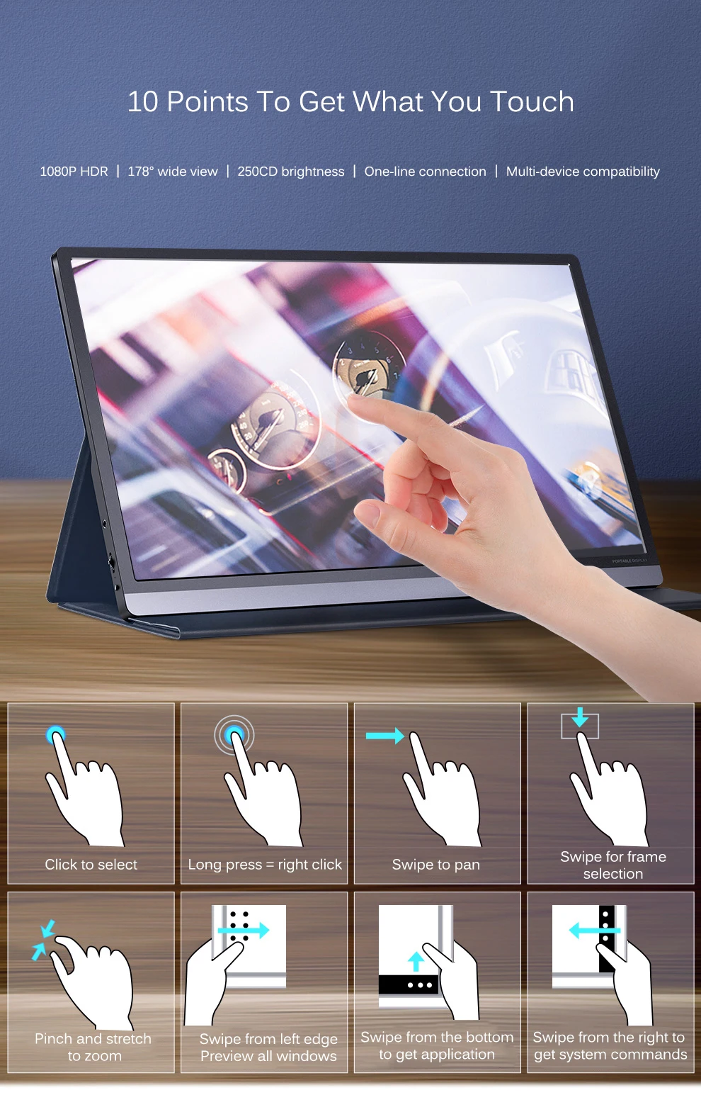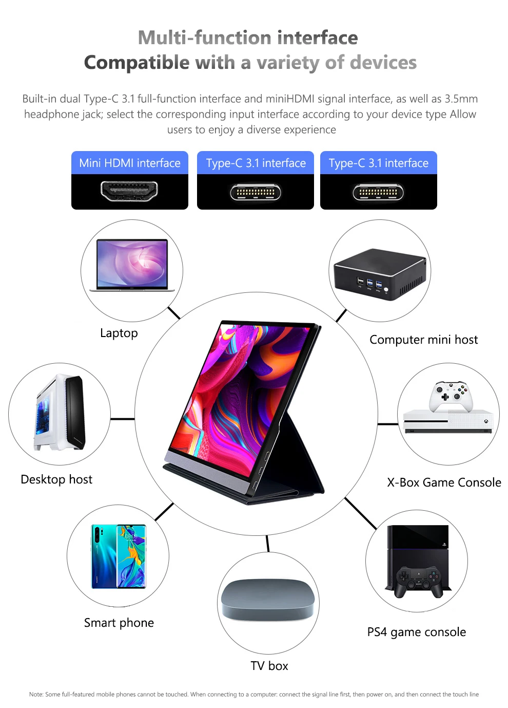 15,6 15,6-дюймовый Большой экран Full HD】Разрешение картинки-это самый мощный 15,6-дюймовый большой экран с разрешением full HD(1920 × 1080)Подходит для игр, просмотра видео и работы в офисе. Широкий диапазон 178 ° вверх и вниз и 178 ° влево и вправо использует ЖК-панель IPS с узнаваемыми естественными тонами, чтобы вы могли видеть яркие изображения под любым углом. Большой экран не ограничен, вес составляет около 658 граммов, а тонкий дизайн-11 мм, который можно легко хранить в дорожных пакетах.【Легкая сенсорная работа более комфортнаяОснащен более естественным и интуитивно понятным 10-точки Мульти-сенсорный принести с высокой чувствительностью светильник операция ощущение. Он также подходит для деловых случаев, таких как демонстрация и другие интересы во время работы экрана. Функция сенсорного экрана поддерживает только телефоны andriod с функцией Type-c 3,1.【Один кабель может поставить экран сигнала и питания supply】Если используемый терминал поддерживает режим преобразования типа C, подключите кабель передачи данных Type-C к кабелю Type-C, и вы можете воспроизводить видео, аудио и питание на дисплее. Кроме того, используйте прилагаемый usb-адаптер и кабель питания для подключения к монитору и питания к клеммам, таким как ПК и смартфоны, подключенные Type-C. * При использовании кабеля передачи данных Type-C для подключения к компьютеру монитор автоматически регулирует яркость, яркость, громкость и переходит в режим энергосбережения. Для стабилизации напряжения, пожалуйста, используйте поставляемый адаптер питания для питания.【Поддерживает широкий спектр разъемовСоединительные клеммы очень универсальны, и есть 2 типа s стандартного HDMI и USB type-C. Интерфейс богатый и может быть обработан без использования нового оборудования. В дополнение к MacBook и поверхности, usb-терминал Type-C также оснащен последними смартфонами iPad Pro и Android. Один терминал Type-C используется для зарядки, но его можно использовать с различными устройствами без конверсионных кабелей. Это очарование. Кабели и т. Д. Включены в качестве стандарта, и дополнительные покупки не требуются. Кроме того, он также оснащен интерфейсом OTG (microUSB), который может быть подключен к мыши и клавиатуре.【Отлично подходит для игр 】Также отлично подходит для игр. Он может быть использован немедленно без добавления драйверов, и высокоскоростной ответ 60 Гц может наслаждаться быстрым контентом, таким как FPS игры и экшн-фильмы. Расширенный режим и режим копирования могут поддерживать обе стороны, не говоря уже о горизонтальном дисплее, а вертикальный дисплей также может быть легко подключен.【Кожаный чехол в комплекте 】Чехол из нескользящего материала чехол можно сложить, чтобы защитить телефон от пыли или царапин. Он поддерживает дисплей HDR, а содержимое HDR, такое как игры PS4, также может максимизировать Красивое описание цвета. Если у вас есть один монитор и провод в небольшом месте встречи, вы можете поделиться файлами или презентациями со своего смартфона на большом экране.Примечание:Поскольку это избыточный вес, если экран и подставка были отправлены вместе, мы должны отправить их отдельно, так что вы можете получить 3% дополнительной скидки, если вы заказываете их вместе.