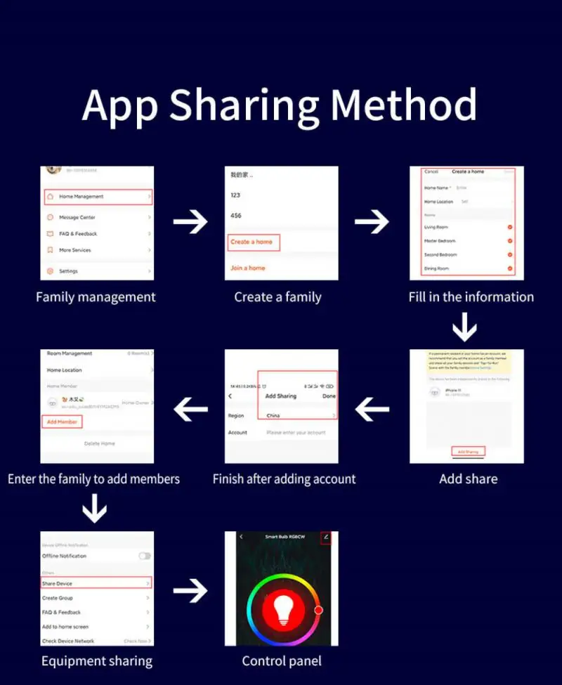 3. Групповое управление и совместное управление: вы можете создать группу для всех ваших умных потолочных светильников, и вы можете управлять ими с помощью только одной команды. Вы также можете поделиться им с другими семьей через приложение, и они также могут использовать свой мобильный телефон для управления им.