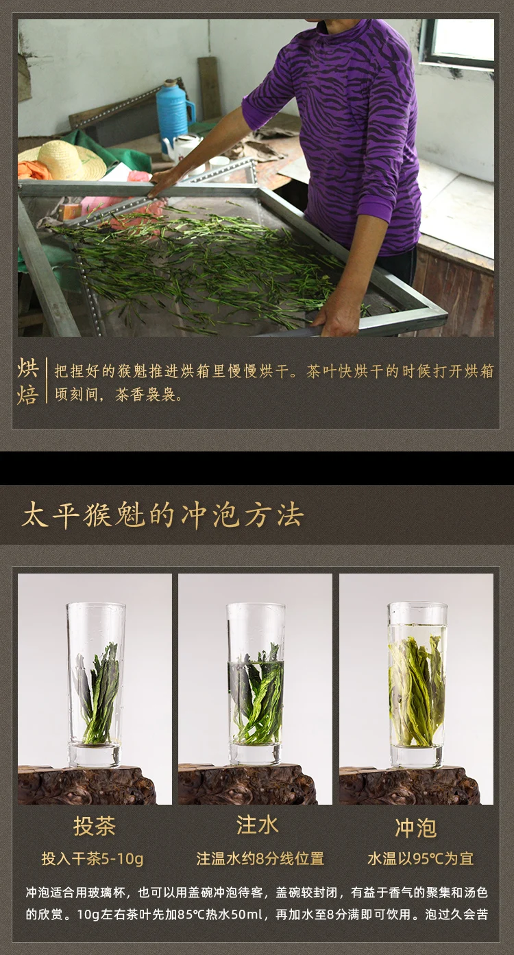 Чай Taiping Monkey Kui прямой, ровный и ровный, толстый и крепкий, с белыми волосами, пышный и невидимый, но не открытый, с бледно-зеленым цветом, основной Веной листьев является свиная печень, как и оливковое; Заваренные в чашке, почки и листья медленно разлетаются, Расслабленный в бутон, два листа держат бутон, или повесить или утонуть; Чайный суп зеленый, ароматный и освежающий.