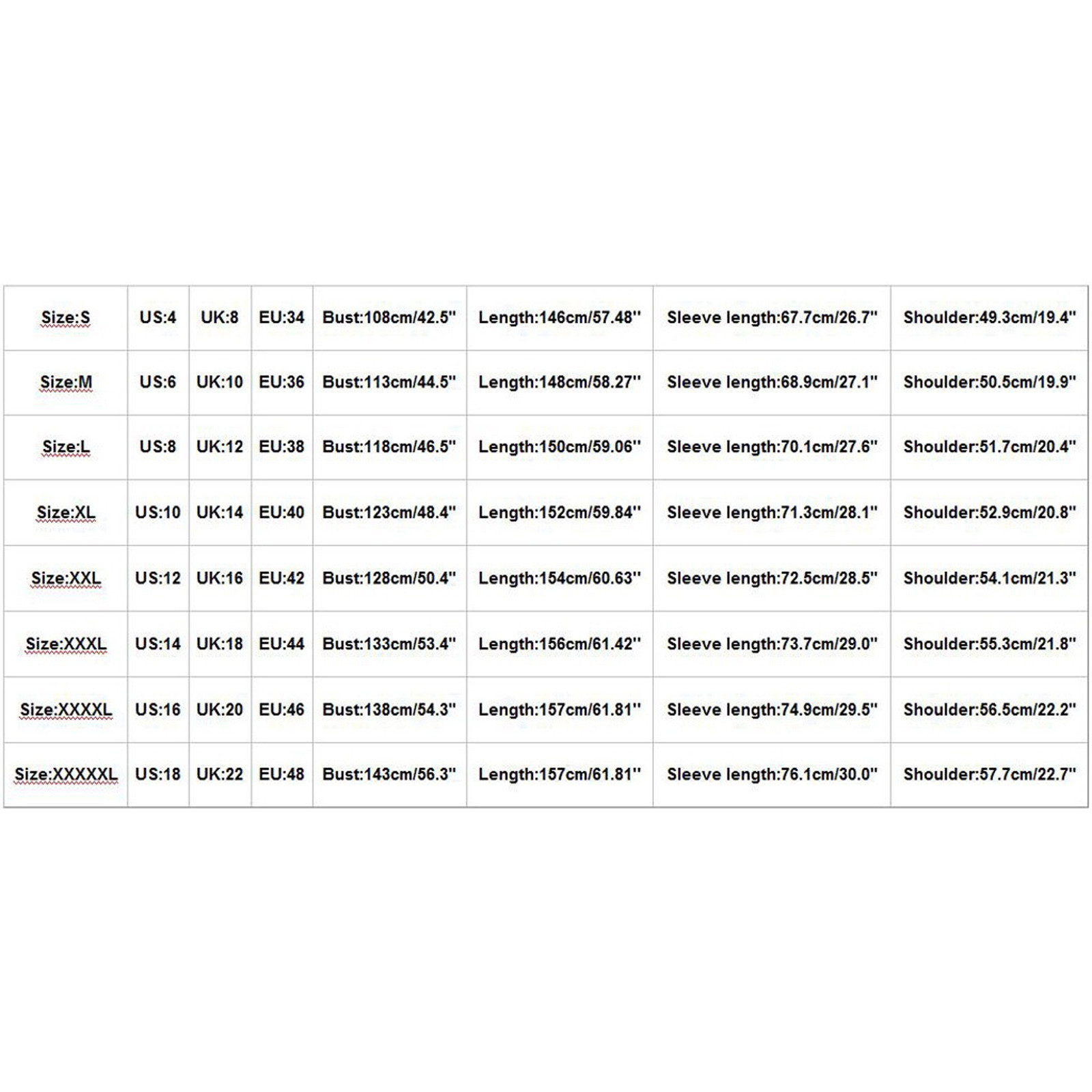 Размеры США Великобритания ЕС Бюст Длина Длина рукава Плечо S 4 8 34 108 см/42,5" 146 см/57,48'' 67,7 см/26,7" 49,3 см/19,4" М 6 10 36 113 см/44,5" 148 см/58,27'' 68,9 см/27,1" 50,5 см/19,9" L 8 12 38 118 см/46,5" 150 см/59,06'' 70,1 см/27,6" 51,7 см/20,4" XL 10 14 40 123 см/48,4" 152 см/59,84'' 71,3 см/28,1" 52,9 см/20,8" XXL 12 16 42 128 см/50,4" 154 см/60,63'' 72,5 см/28,5" 54,1 см/21,3" XХХL 14 18 44 133 см/53,4" 156 см/61,42'' 73,7 см/29,0" 55,3 см/21,8" XXXXL 16 20 46 138 см/54,3" 157 см/61,81'' 74,9 см/29,5" 56,5 см/22,2" XXXXXL 18 22 48 143 см/56,3" 157 см/61,81'' 76,1 см/30,0" 57,7 см/22,7"