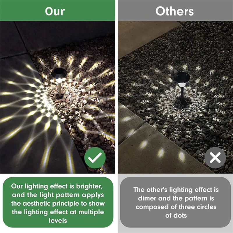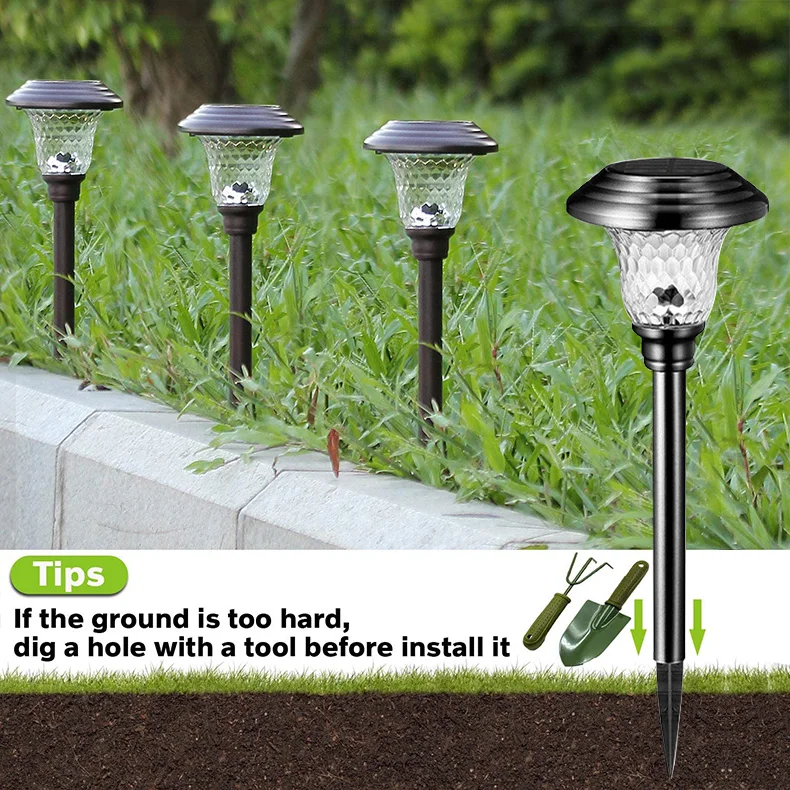Этот уличный светильник на солнечной батарее IP65 Водонепроницаемый, вам не придется беспокоиться о плохой погоде, такой как дождь, снег или ветер, он изготовлен из нержавеющей стали, металлическая втулка устойчива к коррозии и не легко деформируется, Мы усилили заземление вставки, так что светильник можно зафиксировать более прочно.