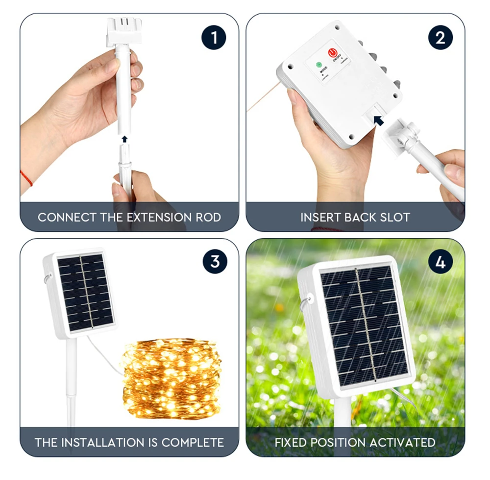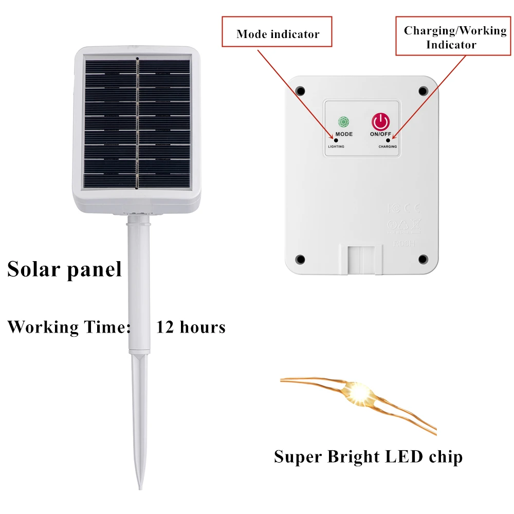 4. Эффективное поглощение и Конвертация --- светодиодный Рождественский свет, разработанный с солнечной панелью и перезаряжаемой батареей, Солнечная гирлянда может работать около 8 часов ночью, если панель поглощает достаточно солнечного света в течение дня.