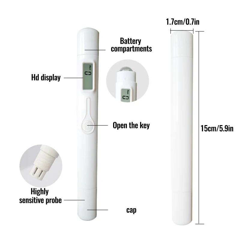 Простота в использовании: Просто поместите тестовую ручку TDS в воду для тестирования, нажмите переключатель, дисплей немедленно покажет значение TDS воды, позволяет более интуитивно понять чистоту воды.