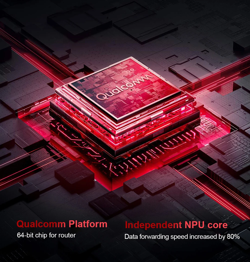 Используя высокопроизводительные чипы маршрутизатора Qualcomm, в дополнение к ЦПУ, ответственному за вычисления, добавлен независимый ядро NPU, чтобы значительно улучшить возможности обработки данных и уменьшить перегрузку сети