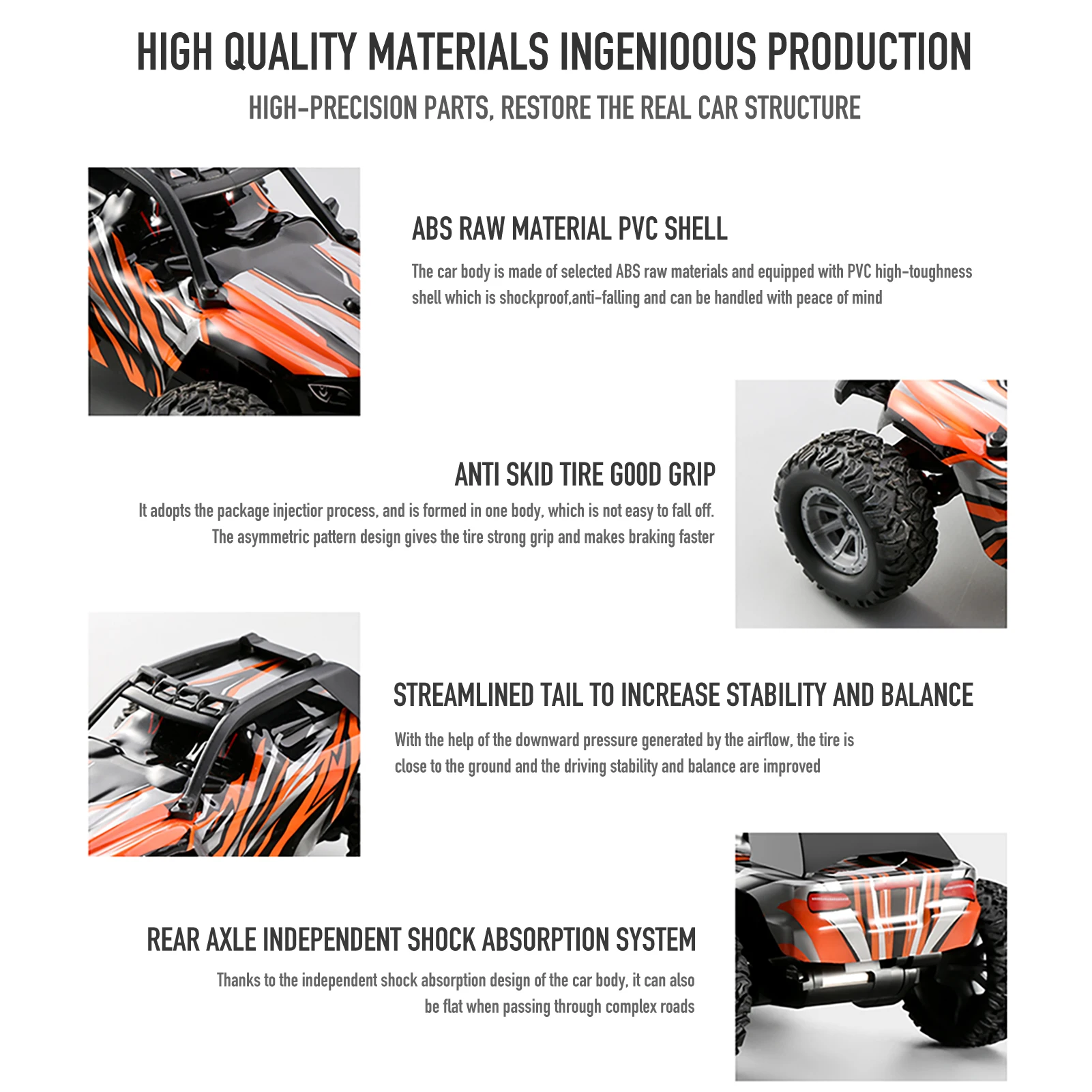 Благодаря 2,4 ГГц система управления, с пришитыми точками против скольжения; Шины, обтекаемый хвост, независимый амортизацией, двухдиапазонный, Wi-светодиодный ламп, в натуральную величину, дроссельная заслонка, переключатель двойной регулировки скорости и большая емкость батареи, наш высокоскоростной автомобиль предлагает вам гибкий, стабильный высокоскоростной опыт вождения.