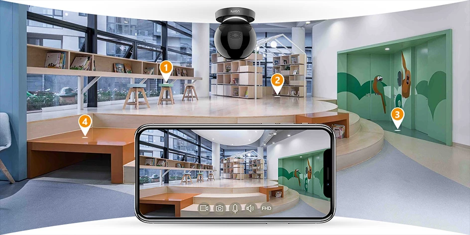 Камера безопасности в помещении поддерживает 355 градусов по горизонтали и 90 градусов по вертикали, обеспечивая вашему дому всестороннюю защиту 360 ° без слепого зума.
