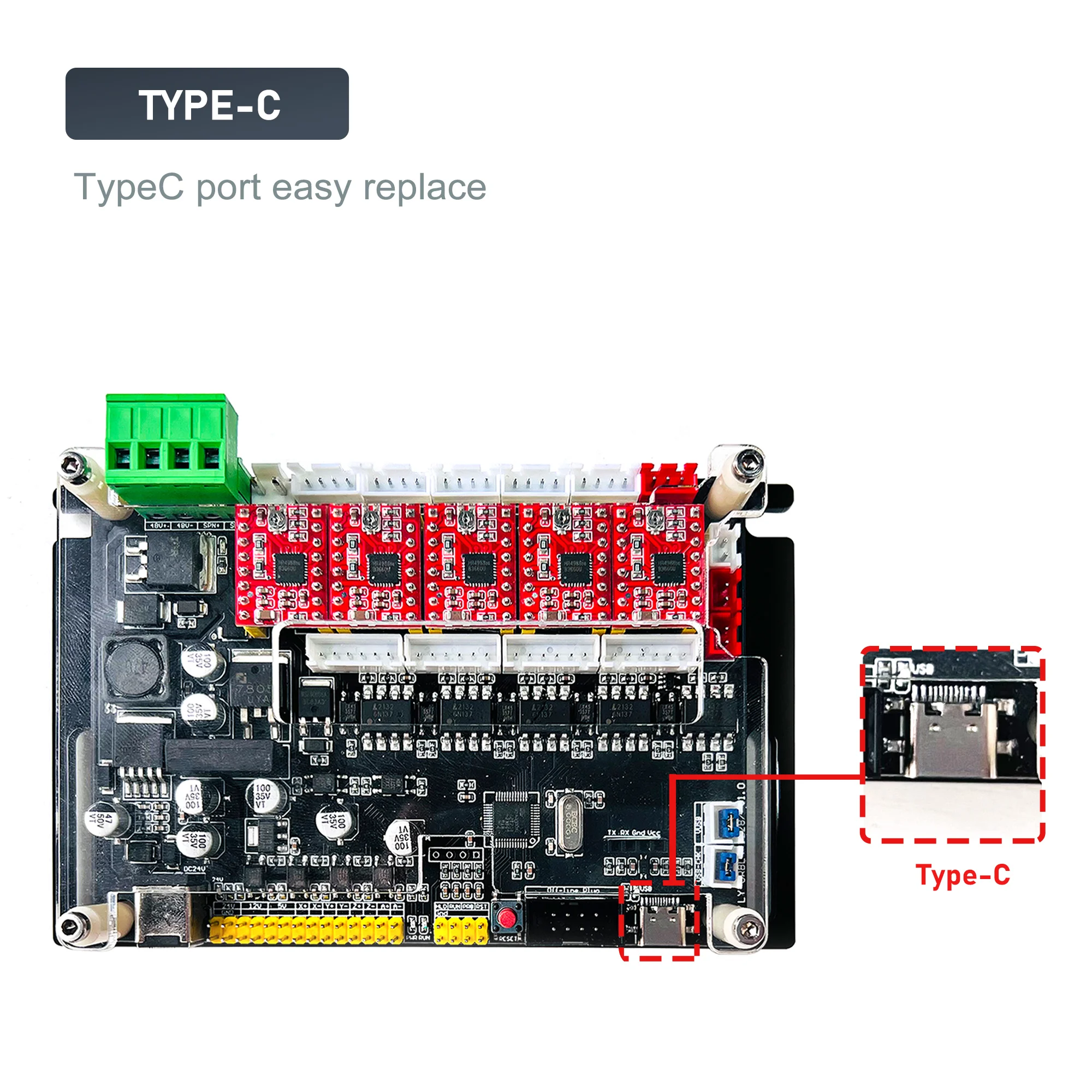 Этот контроллер поддерживает 4 оси XYZA и двухосный драйвер Y, более мощная способность вождения