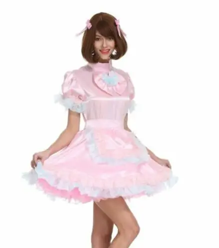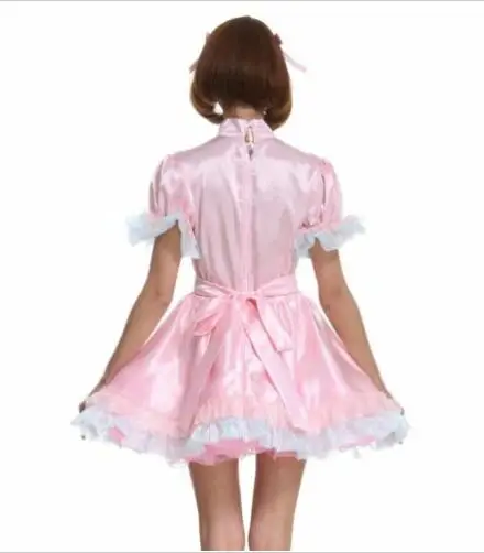 Pink Satin Shawl Lockable Bow Satin Bubble Sleeve Maid Adult Sissy Dress Lovely Sweet Ruffle Cake Skirt