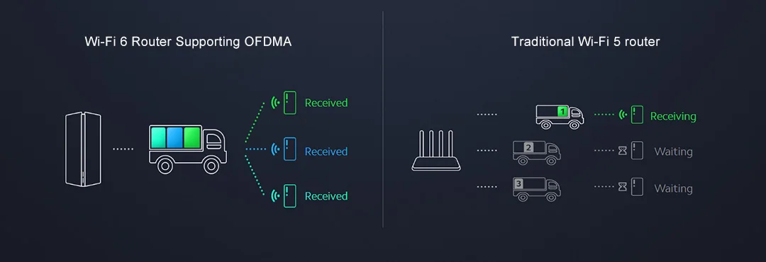 OFDMA technology allows routers to process data flows from multiple devices simultaneously when large devices require data transmission, effectively reducing network congestion and greatly reducing latency.