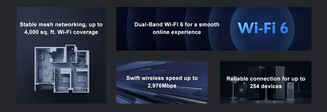 Xiaomi Mesh System AX3000 (2-Pack) combines into a mesh network that provides Wi-Fi 6 coverage throughout the home, covering up to 4,000 square feet of space. Xiaomi Mesh System AX3000 supports mesh networking with the same model and/or Mi Router AX9000 for up to 10 total devices. The signal roams between different routers automatically and seamlessly, allowing you to play as you go.