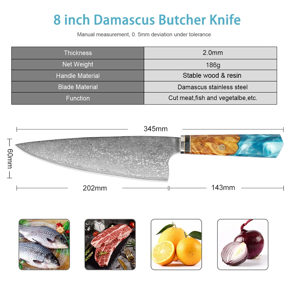 Высокое качество:Изготовлен из 67 слоев высокоуглеродистой дамасской стали, ядро VG10, твердость может достигать 62HRC, с сильной антикоррозийной, антикоррозийной и прочной