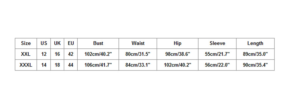 Размеры США Великобритания ЕС Бюст Талия Бедра Рукав Длина XXL 12 16 42 102 см/40,2" 80 см/31,5'' 98 см/38,6'' 55 см/21,7'' 89 см/35,0'' XХХL 14 18 44 106 см/41,7'' 84 см/33,1'' 102 см/40,2'' 56 см/22,0'' 90 см/35,4''