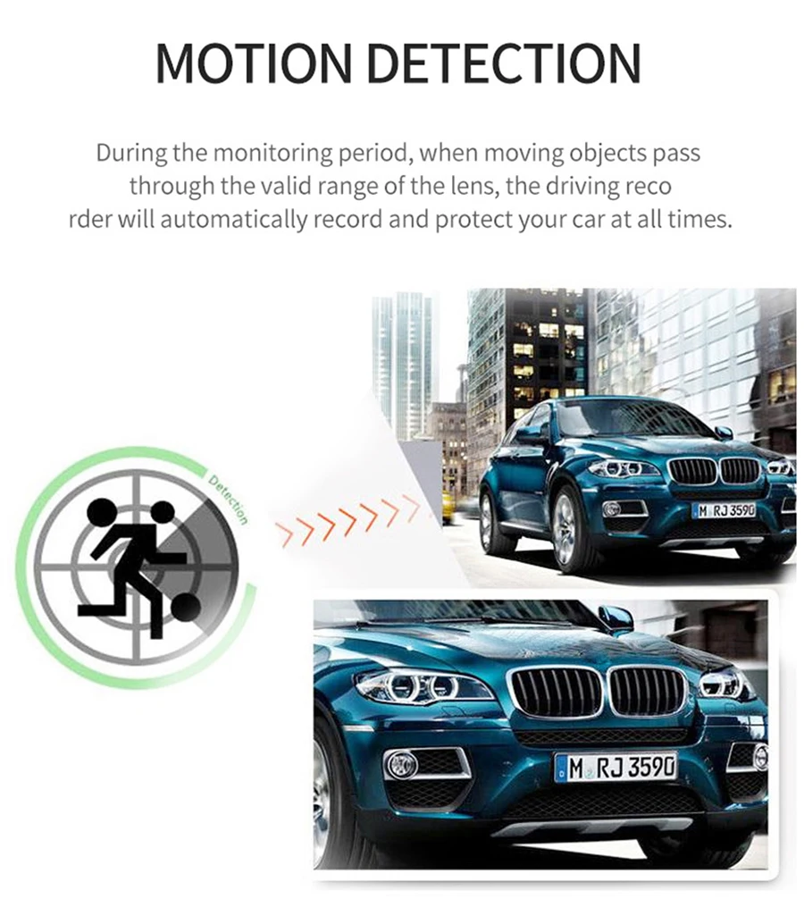 24-часовой мониторинг парковки, когда происходит столкновение во время парковки, система автоматически включит видео мониторинг, чтобы защитить ваш автомобиль 24 часа в сутки.