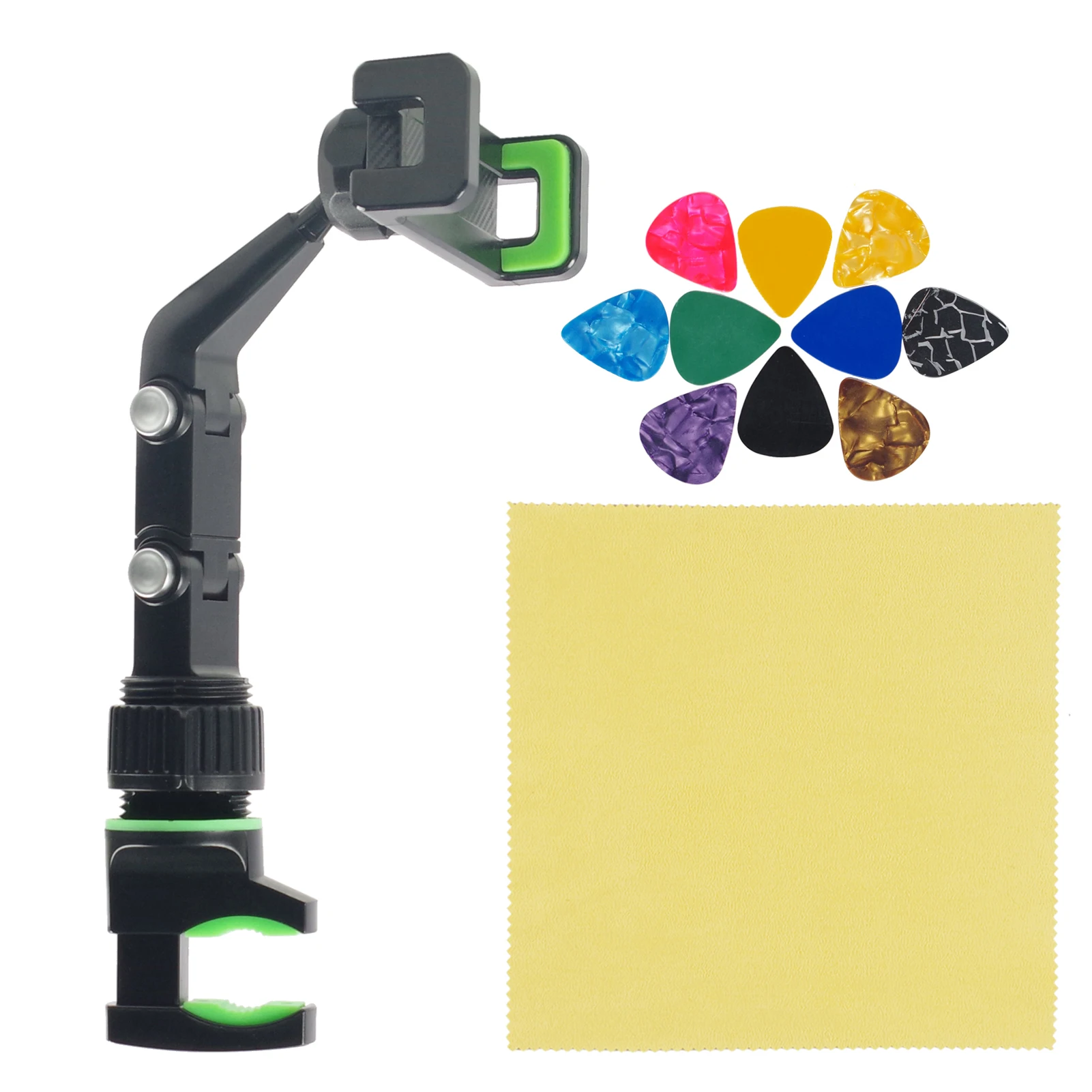 Это многофункциональный держатель для телефона, который используется для записи видео, просмотра текста, потоковой передачи в реальном времени, обучения просмотру видео и многого другого. Он регулируется и вращается, очень гибкий, чтобы быть зажатым в любом месте вы хотите. Кроме того, в посылка входит 10 штук гитарной палочки и протирочная ткань.
