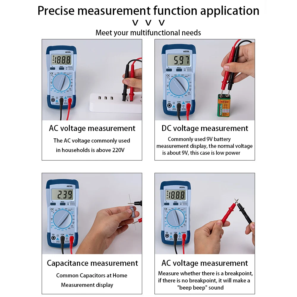 1. Использование: точно измеряет ток постоянного/переменного тока, напряжение, сопротивление, температуру, емкость, диод, нулевой/пожарный провод, частоту и так далее.