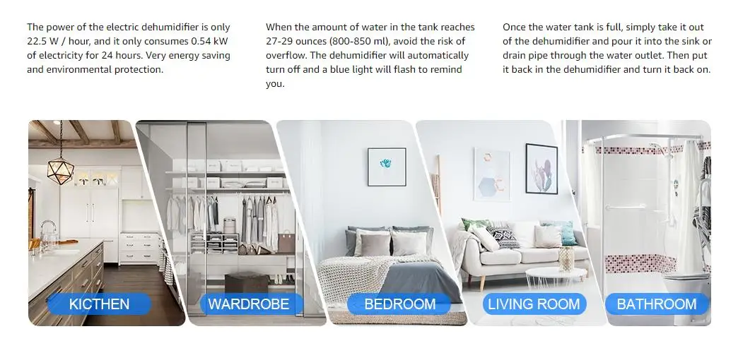 💦 【Environmental Protection】 The power of the humidity dehumidifier is only 22.5 W / hour, and it only consumes 0.54 kW of electricity for 24 hours. It won't cost you too much while giving you a healthy quality of life.