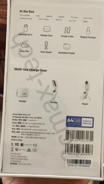 В коробке:1x GO 2, 1x зарядный чехол, 1x Защита объектива (предварительно установленная на объектив по умолчанию), 1x Магнитная подвеска, 1x опорная подставка, 1x легкий зажим и 1x кабель для зарядки Type-C.