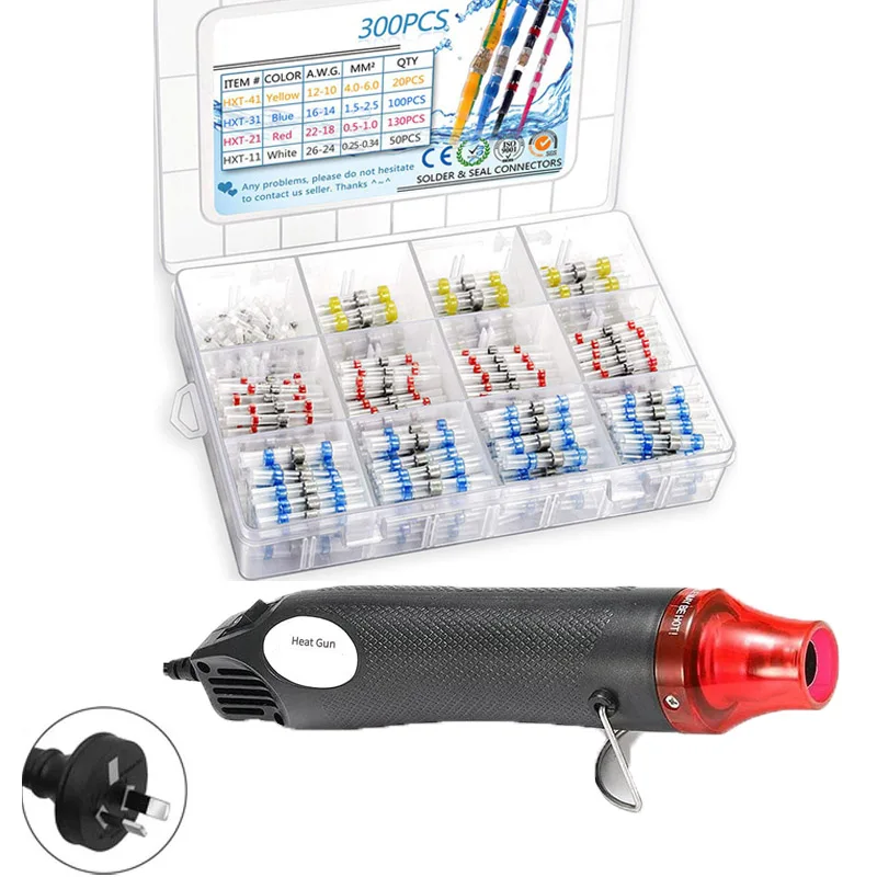 Цвета и размеры:Красный разъем:Костюм кабель/размер провода 22-16 AWG 0,5-1,5 м 23 23 штСиний разъем:Костюм кабель/размер провода 16-12 AWG 1,5-2,5 м 12 12 штЖелтый разъем:Костюм кабель/размер провода 12-10 AWG 4,0 m ㎡ 10 штБелый разъем:Костюм кабель/провода Размеры 26-24 AWG 0,25-0,34 м ㎡ 5 шт. ---------------------- 100 шт. ------------------------------------ Цвета & Размеры:Красный разъем:Костюм кабель/размер провода 22-16 AWG 0,5-1,5 м 35 35 штСиний разъем:Костюм кабель/размер провода 16-12 AWG 1,5-2,5 m 30 30 штЖелтый разъем:Костюм кабель/размер провода 12-10 AWG 4,0 m ㎡ 10 штБелый разъем:Костюм кабель/провода Размеры 26-24 AWG 0,25-0,34 м ㎡ 25 шт. ---------------------- 300 шт. ------------------------------------ Цвета & Размеры:Красный разъем:Костюм кабель/размер провода 22-16 AWG 0,5-1,5 м 100 100 штСиний разъем:Костюм кабель/размер провода 16-12 AWG 1,5-2,5 m 100 100 штЖелтый разъем:Костюм кабель/размер провода 12-10 AWG 4,0 m 30 30 штБелый разъем:Кабель для костюма/размер провода 26-24 AWG 0,25-0,34 м 70 70 шт. -------------------------------------------- 1 шт. пистолет для горячего воздуха Материал: пластик и металл вилка: вилка США/ЕС Цвет: черный Размер: прибл. 225*47*20 мм Входное напряжение: 220 В мощность: 300 Вт температура: до 200 ℃ Диапазон рабочих температур Рабочая температура: -55 ℃ ~ 125 ℃ минимальная температура усадки: 60 ℃ начальная температура припоя расплава: 138 ℃ температура полного припоя melt160 ℃ Цвет: красный, синий, белый, желтый, черный посылка в комплекте: Термоусадочные Провода 50/100/300