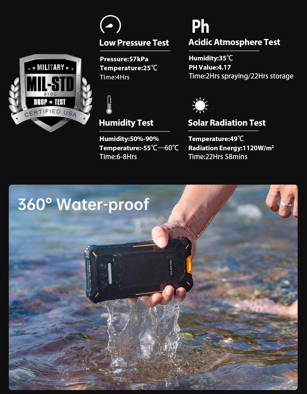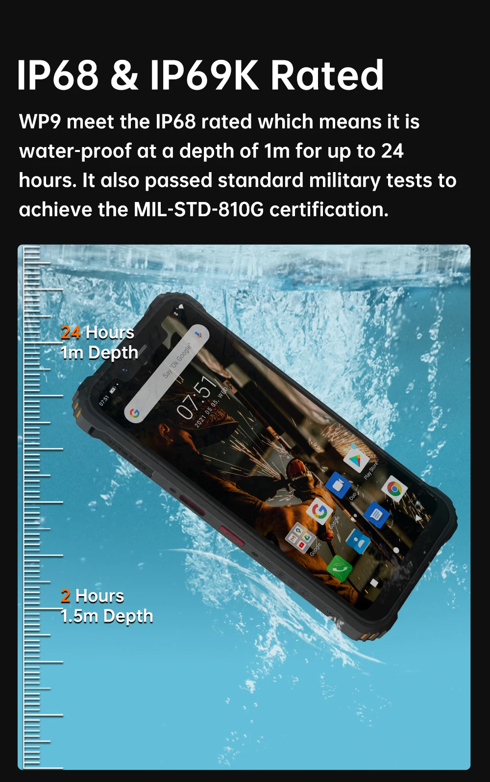 WP9 соответствует классу IP68, что означает, что он является водонепроницаемым на глубине 1 м в течение 24 часов. Он также прошел стандартные военные испытания для достижения MIL-STD-810G сертификации.