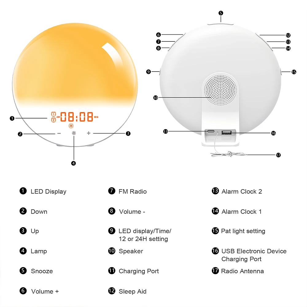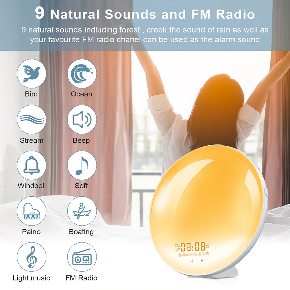 Наш будильник пробуждения поставляется с 9 видами звуков, чтобы выбрать, чтобы проснуться с комфортом, такие как чистая музыка, птицы, лес, волны, звуковой сигнал. Это помогает вам просыпаться более естественно, чем громкий обычный сигнал тревоги с этим новым обновленным светильник пробуждения