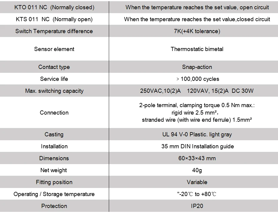 KTO 011: тепло Термостат (нормально закрытый); Контактный выключатель для регулирования нагревателей.
