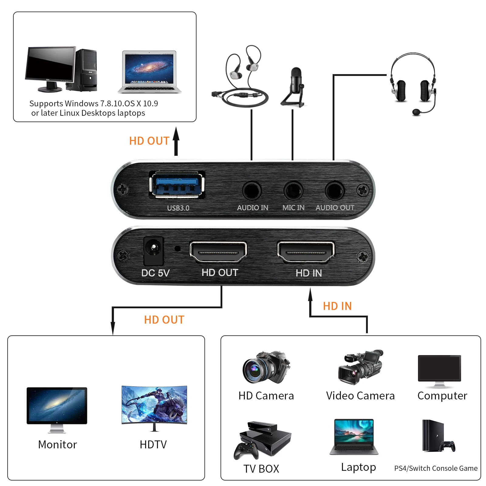 【USB 3,0 HDMI видео Захват Card】: карта захвата на основе высокоскоростной технологии USB 3,0, он может захватывать один одноканальный HD HDMI видео сигнал. Он может воспользоваться функциями, встроенными в текущее программное обеспечение, чтобы получить бесшовный опыт. Примечание: Мы также поставляем дополнительный кабель USB 3,0 для типа C, кабель USB 3,0 для USB 3,0, кабель HDMI для HDMI
