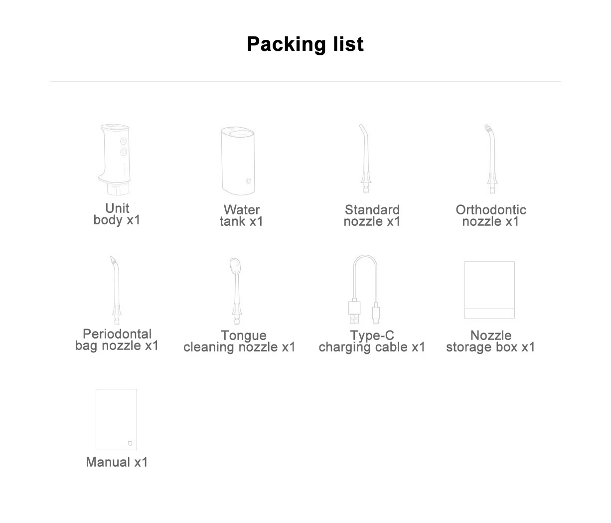 *The water tank of the dental irrigator is 200mL, and the control deviation is ±10mL. Do not add chemicals such as mouthwash to the water tank, and it is recommended to use clean water.