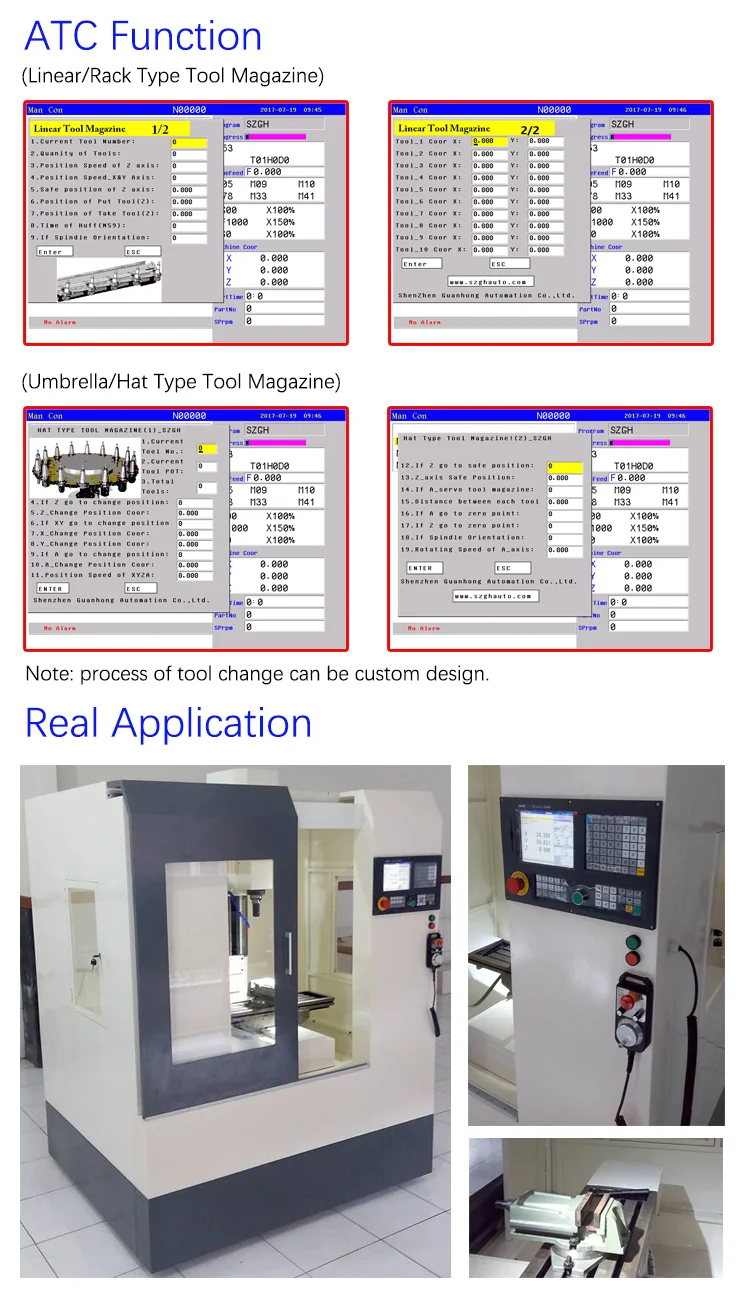 SZGH-CNC1000MDb-3 является профессиональным 3 осевой фрезерный станок с ЧПУ контроллер разработаны Shenzhen Guanhong автоматизации CO.,LTD (короткое название: SZGH ), который может управлять тремя осями подачи, двумя шпинделями anglog, 2 мс интерполяция на высокой скорости, 1 мкм точность, что, очевидно, повышает эффективность, точность и качество поверхности деталей для обработки.