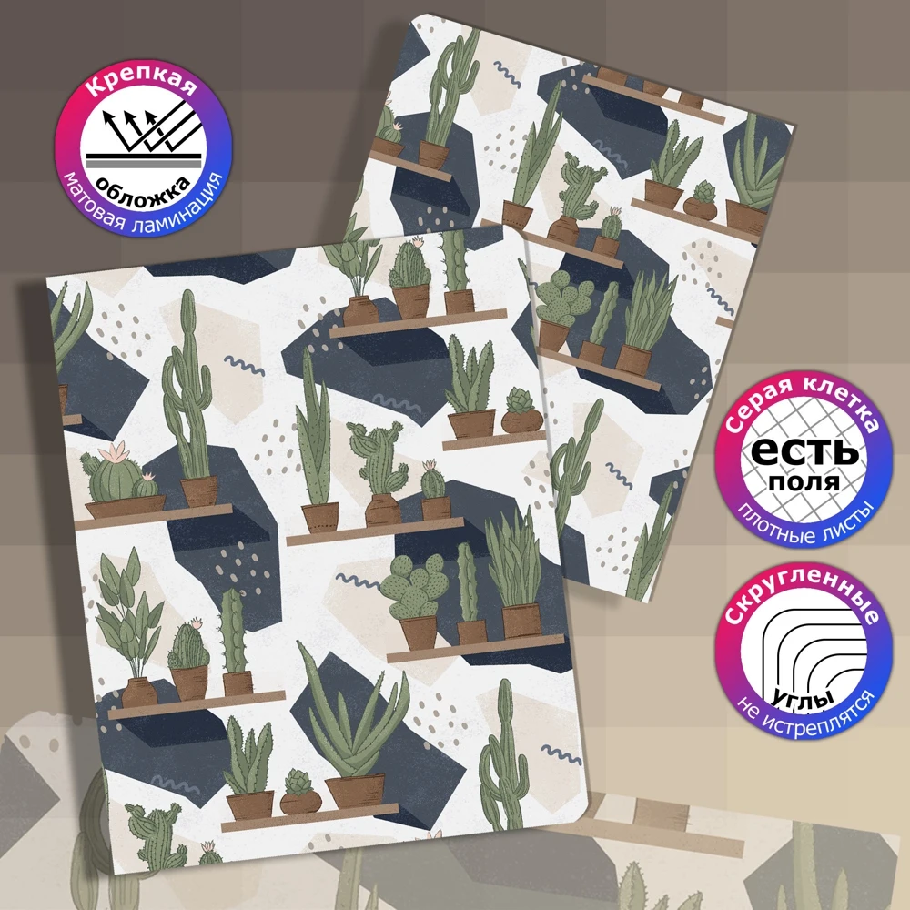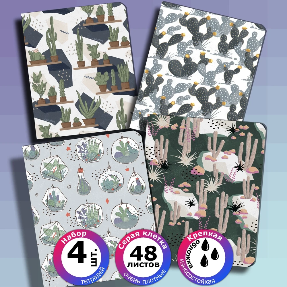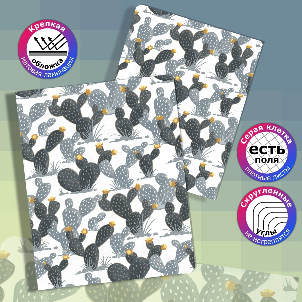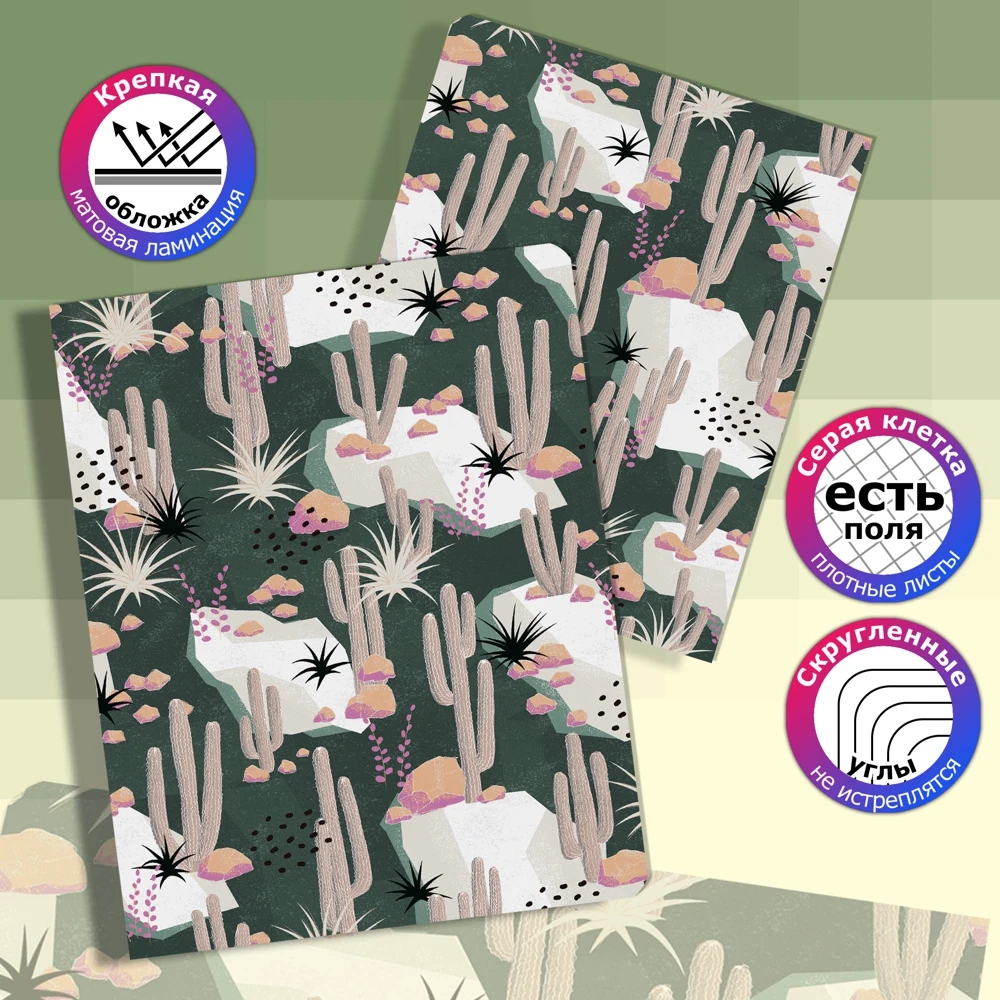 If you are looking for stylish notebooks in a cage, such as could highlight you among classmates, classmates or colleagues, in front of you the most suitable set. These are spectacular school notebooks with cactus. You'll be saving this tetradec set. It is so beautiful that it is a pity to write in it. each school notebook from a set to a cage of 48 sheets.