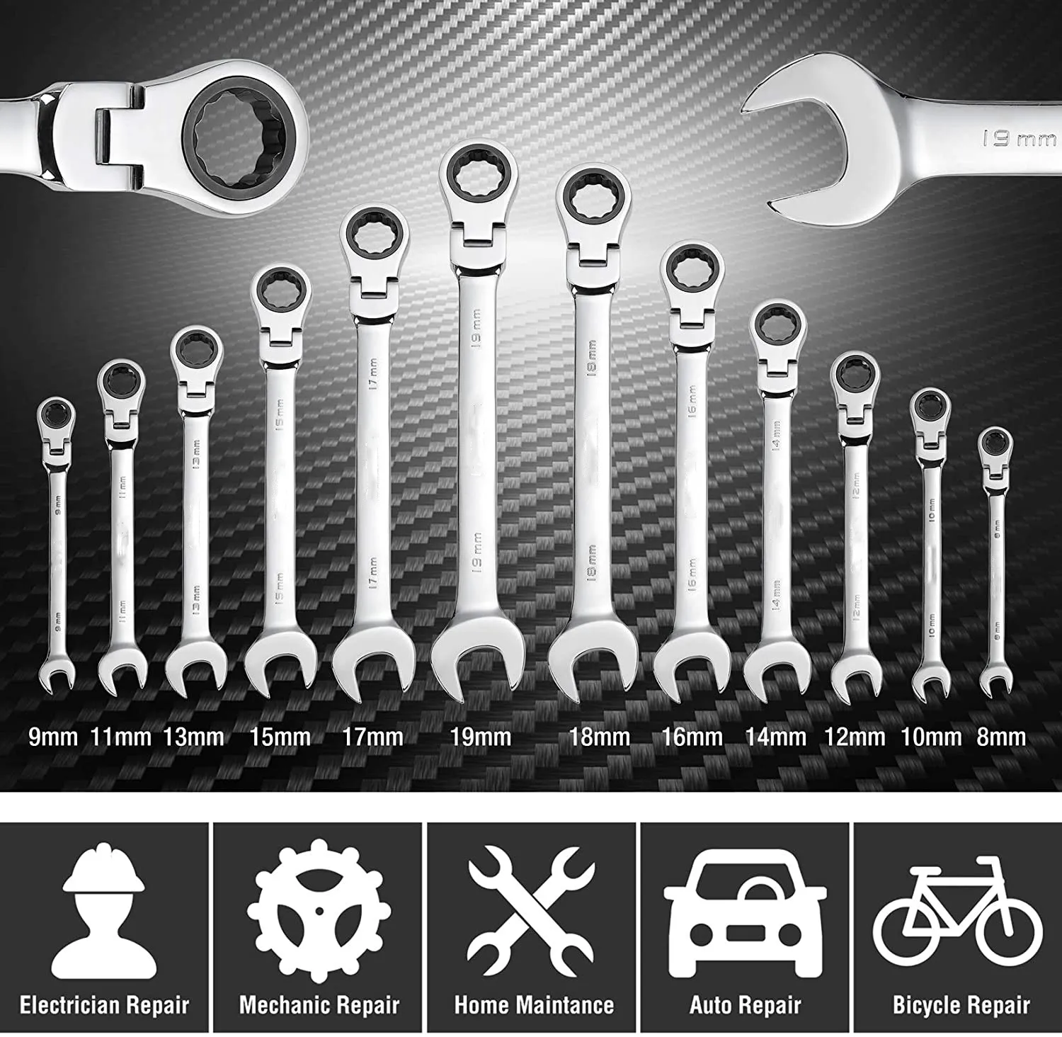 Гибкая головка на 180 °] гибкая головка на 180 градусов поможет вам добраться до самых плотных мест, где большинство трещоточных ключей не достигнет. В 72-зубчатой храповой шестерни нужен только 5 градусов Рабочая качели дуги подойдет к любому узком пространстве. Набор гаечных ключей специально разработан для работы в плотных помещениях.