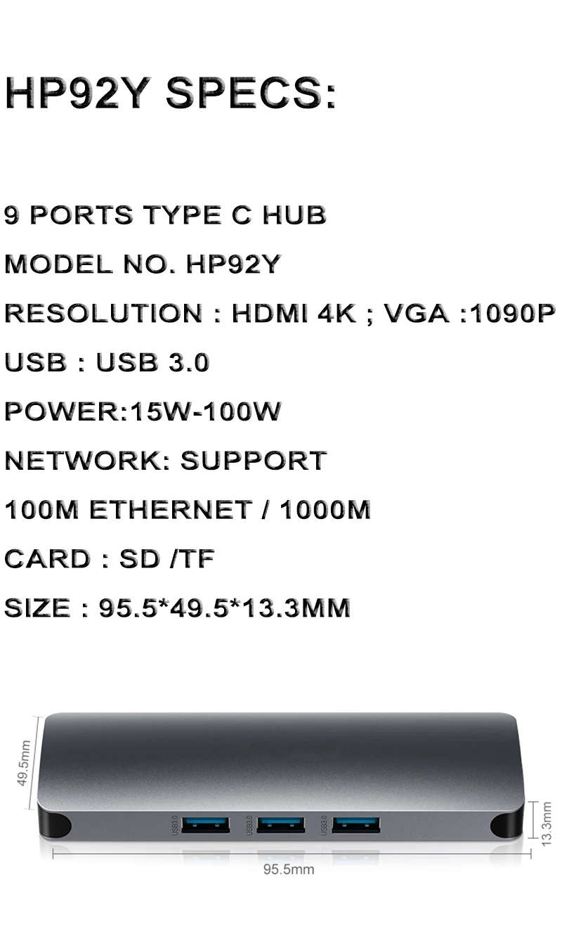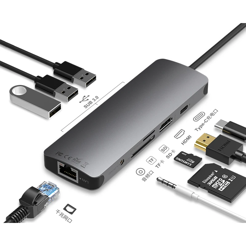 9 Ports : 1Type c PD 100W +3USB3.0 +SD/TF card reader +1*RJ45 Ethernet 1000mbps +1AUX Audio 3.5mm +1*HDMI 4K 30HZ