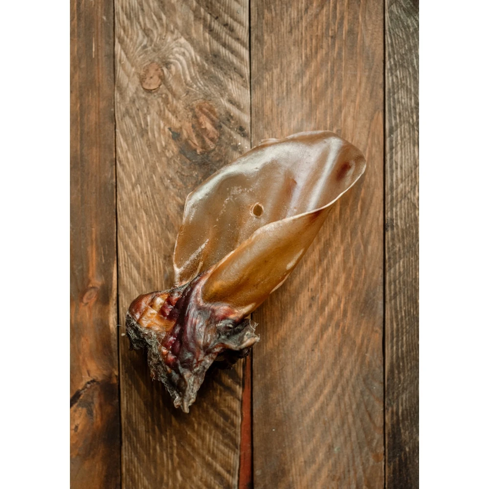 Говяжье ухо не содержит углеводы, благодаря чему уместно применять это лакомство в диетическом питании. В состав входят такие макро- и микроэлементы, как кальций, йод, магний, железо, сера, калий и фосфор. Говяжьи уши содержат витамины В1 и В2, крайне важные для здоровья собаки. Лакомство подойдет для собак небольших, средних, и крупных пород, поможет тренировать челюстные мышцы и укреплять десны, а также механически очищать зубы собаки от налета и остатков пищи, что является прекрасной профилактикой пародонтоза, гингивита, а также болезней желудочно-кишечного тракта.