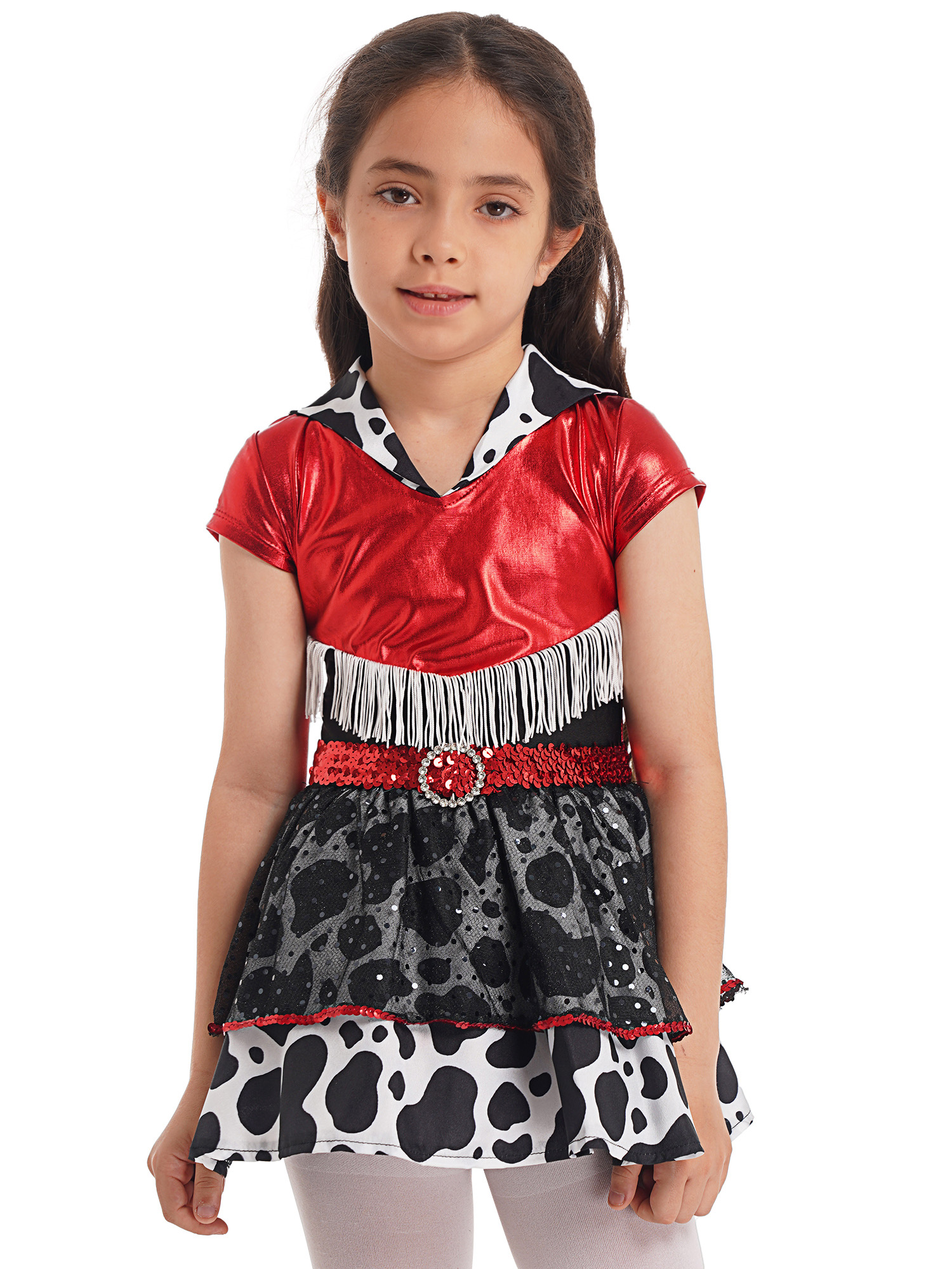 Воротник с лацканами, короткие рукава, кисточки и блестки, украшенные поясом и рукавами на рукавах.