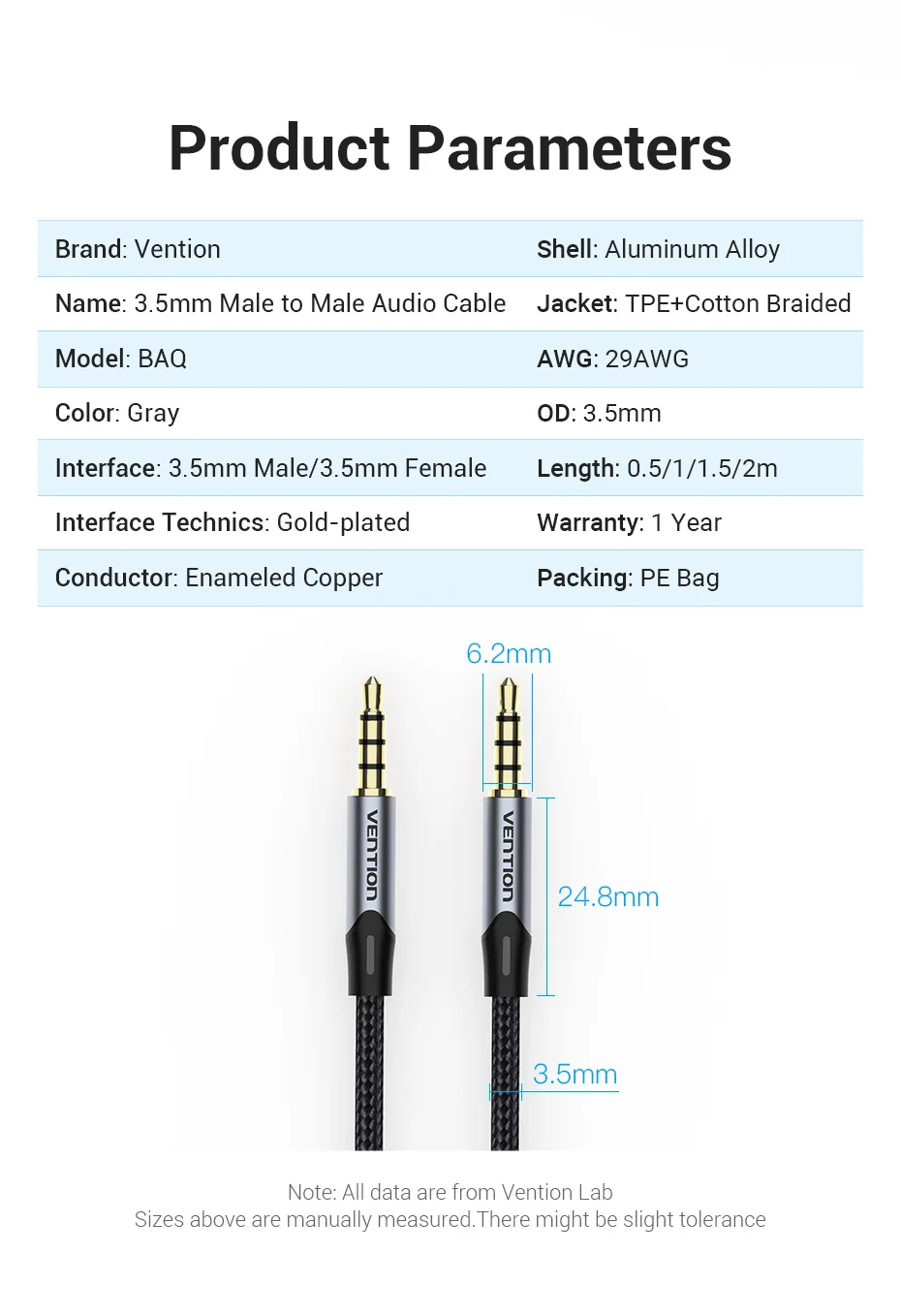 Vention premium 3.5mm male-to-male audio cable is used to connect iPod, iPhone or media player to car stereo or speaker. 90 degree right angle interface, easy to connect and store. The slim metal housing connector allows you to plug it into the power supply without removing the phone/tablet housing.