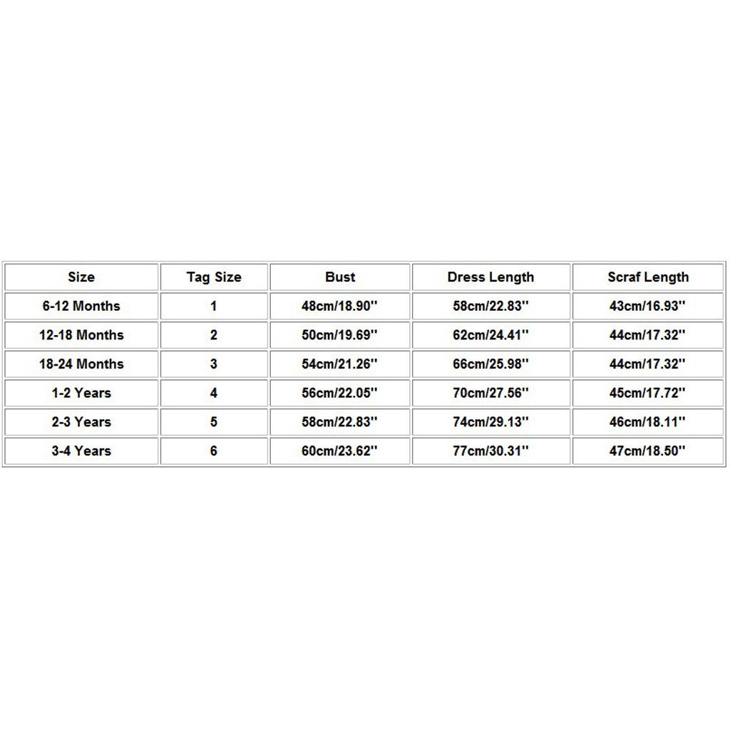 Рекомендуемый возраст Размер бирки Бюст Длина платья Scraf длина 6-12 месяцев 1 48 см/18,90'' 58 см/22,83'' 43 см/16,93'' 12-18 месяцев 2 50 см/19,69'' 62 см/24,41'' 44 см/17,32'' 18-24 месяцев 3 54 см/21,26'' 66 см/25,98'' 44 см/17,32'' От 2 до 3 лет 4 56 см/22,05'' 70 см/27,56'' 45 см/17,72'' От 3 до 4 лет 5 58 см/22,83'' 74 см/29,13'' 46 см/18,11'' От 4 до 5 лет 6 60 см/23,62'' 77 см/30,31'' 47 см/18,50''