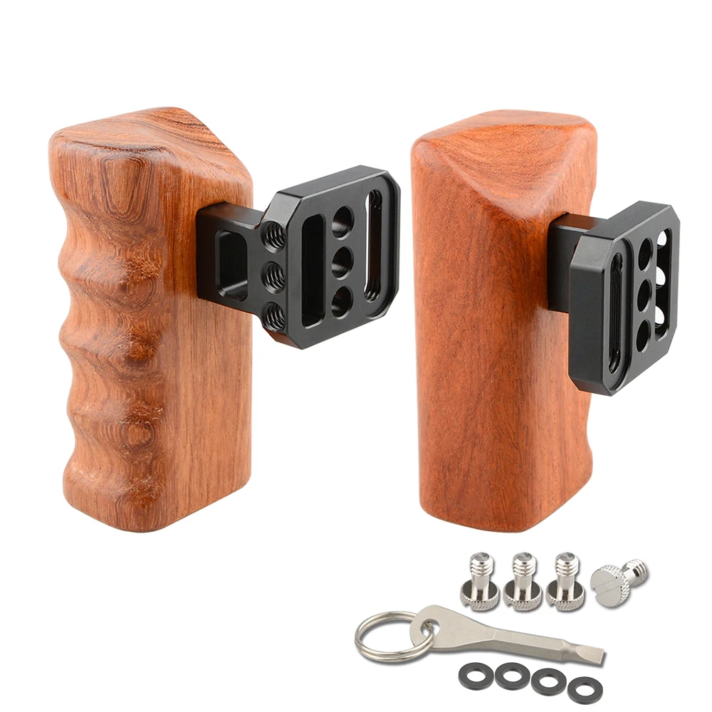 • Деревянные ручки специально разработаны для видеокамеры DV, совместимы с красной камерой, красной установкой и другой зеркальной камерой. Каждый может быть прикреплен к двум резьбовым отверстиям 1/4 "-20, расстояние от 9 мм до 20 мм от центра до центра. Соединитель имеет специальный паз, так что вы можете сдвинуть гнездо крышки захватили винты вдоль него, чтобы соответствовать вашей клетки. Отклонение может быть предотвращено двумя винтами для крепления конструкции. Вы можете удобно держать с эргономичным дизайном во время съемки.