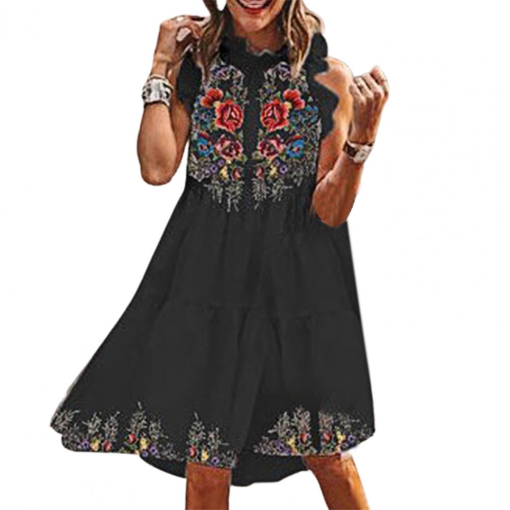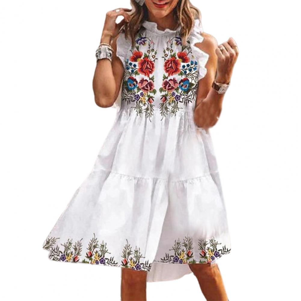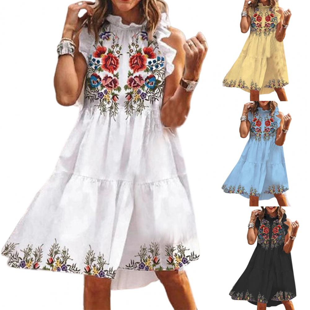 Модное платье с цветочным принтом; Свободное женское платье без рукавов с оборками; Вечерние уличные платья длиной до колена