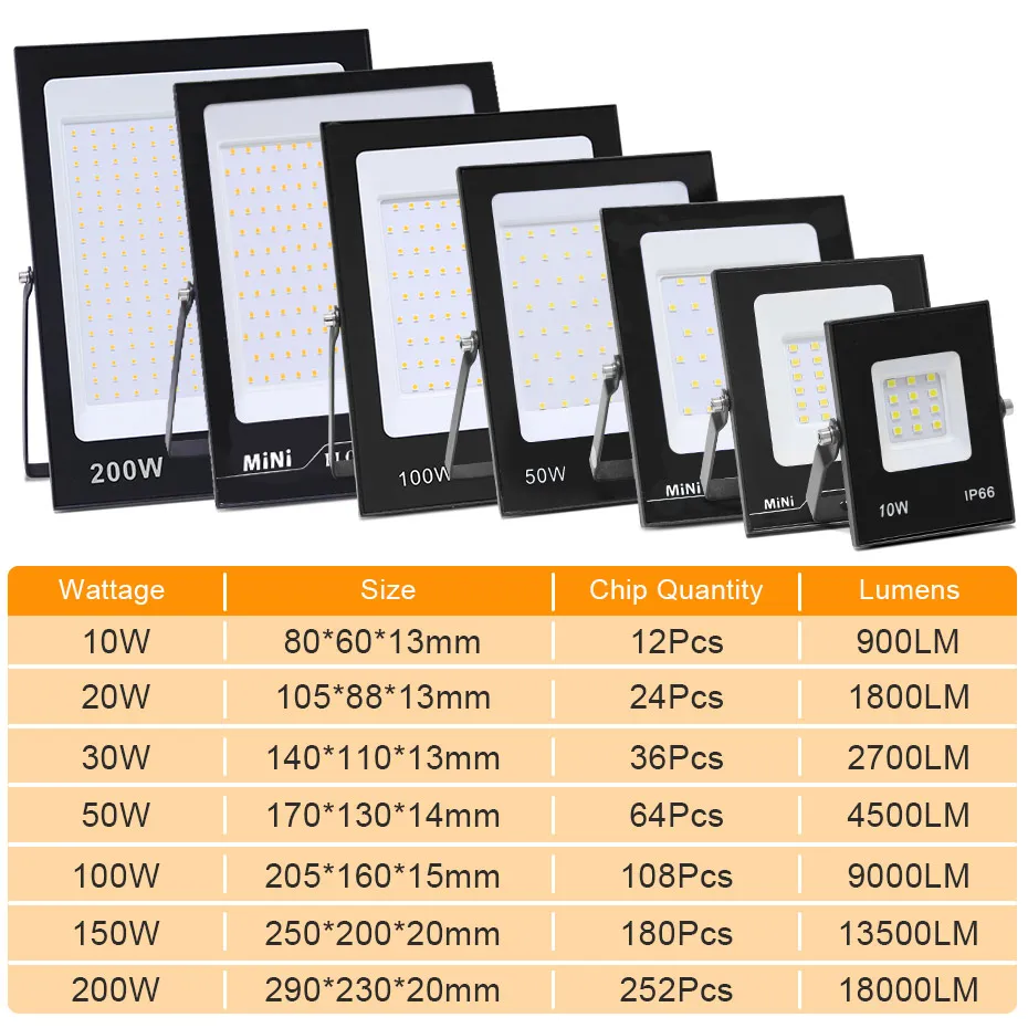 Lumens: (10W)900LM/ (20W)1800LM/ (30W)2700LM/ (50W)4500LM/ (100W)9000LM/ (150W)13500LM/ (200W)18000LM
