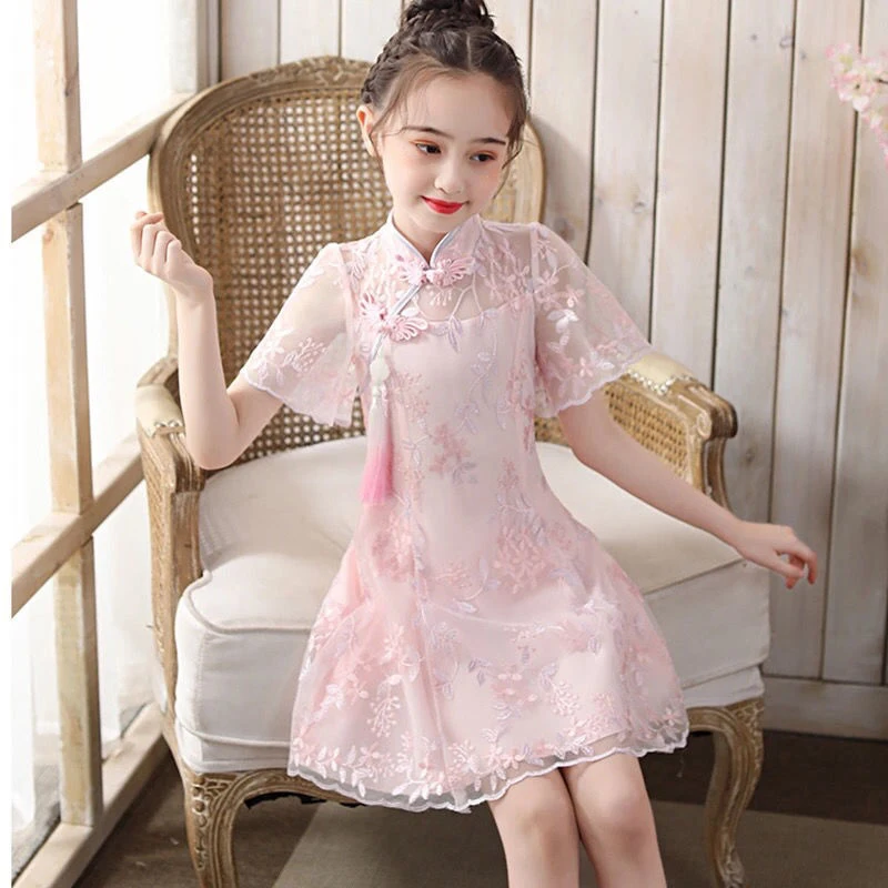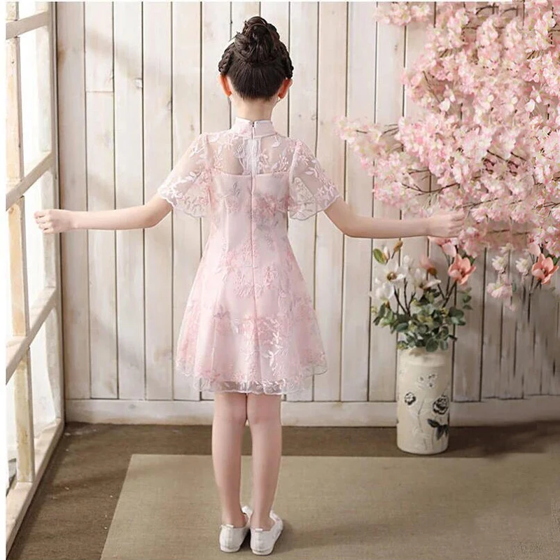 Традиционная китайская одежда с кружевными цветами Ципао для маленьких девочек; Вечерние платья; Детское элегантное платье принцессы розового цвета