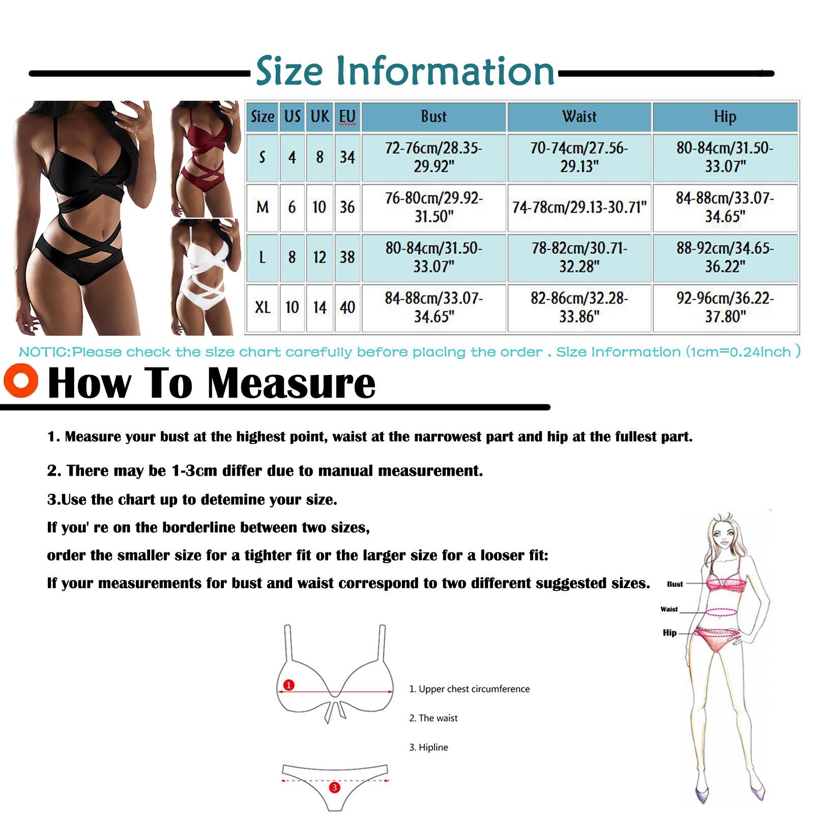 Size US UK EU Bust Waist Hip S 4 8 34 72-76cm/28.35-29.92'' 70-74cm/27.56-29.13'' 80-84cm/31.50-33.07'' M 6 10 36 76-80cm/29.92-31.50'' 74-78cm/29.13-30.71'' 80-84cm/31.50-33.07'' L 8 12 38 80-84cm/31.50-33.07'' 78-82cm/30.71-32.28'' 88-92cm/34.65-36.22'' XL 10 14 40 84-88cm/33.07-34.65'' 82-86cm/32.28-33.86'' 92-96cm/36.22-37.80''