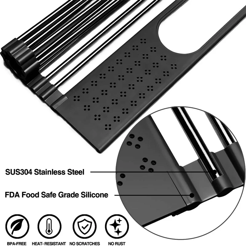 Safe and Heat Resistant: The sink drying rack is made of 304 stainless steel and food grade silicone material. Dish drainer is BPA free and heat resistant up to 260°C.
