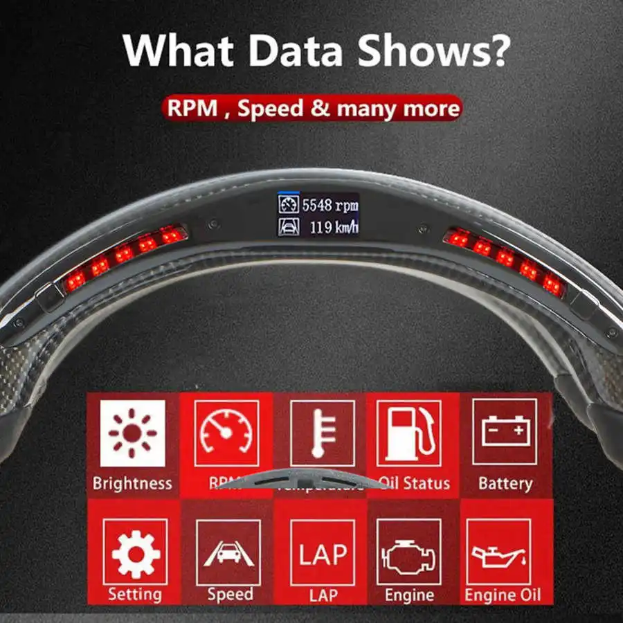 1. Принцип работы: с каждой стороны рулевого колеса есть светодиодные индикаторы, которые постепенно Загораются Зеленым цветом по мере увеличения оборотов двигателя, а диапазон регулируется от 500 до 9900 об/мин. Как только вы установите обороты, индикатор будет мигать красным в качестве напоминания о сдвиге вверх.