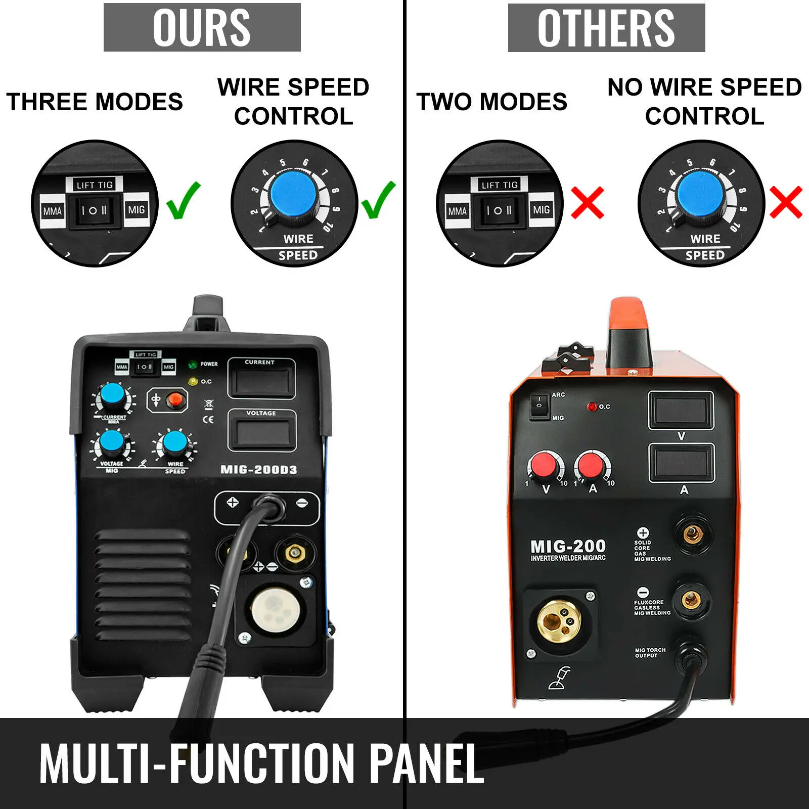 По сравнению с конкурентами, наш сварочный аппарат имеет кнопку скорости, которая может контролировать скорость подачи проволоки в зависимости от различных приложений и различной толщины сварки. Кроме того, отличительный ЖК-монитор и переключатель также могут помочь вам управлять машиной более легко.
