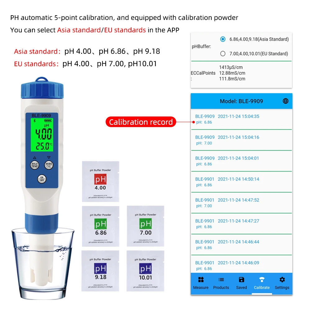 Совет:1. Одна страница отображает 7 элементов данных одновременно, что удобно и быстро считывает данные.2. Мобильный телефон приложение контролирует подсветку или нет подсветки3. Отображать процент батареи4. Данные могут храниться или сохраняться, и после сохранения, они могут быть экспортированы в виде листа EXCEL на компьютер или мобильный телефон, и печать поддерживается.5. Включите автоматическое сохранение, и данные будут сохранены каждые 30 секунд.6. Диапазон PH или EC может быть установлен свободно, если диапазон превышен, это может быть запрошено7, 2 вида методов калибровки, по умолчанию является азиатским стандартом (4,00, 6,86, 9,18). Если вам нужно откалибровать Европейский режим (7,00, 4,00, 10,00), пожалуйста, включите стандарт в приложении.