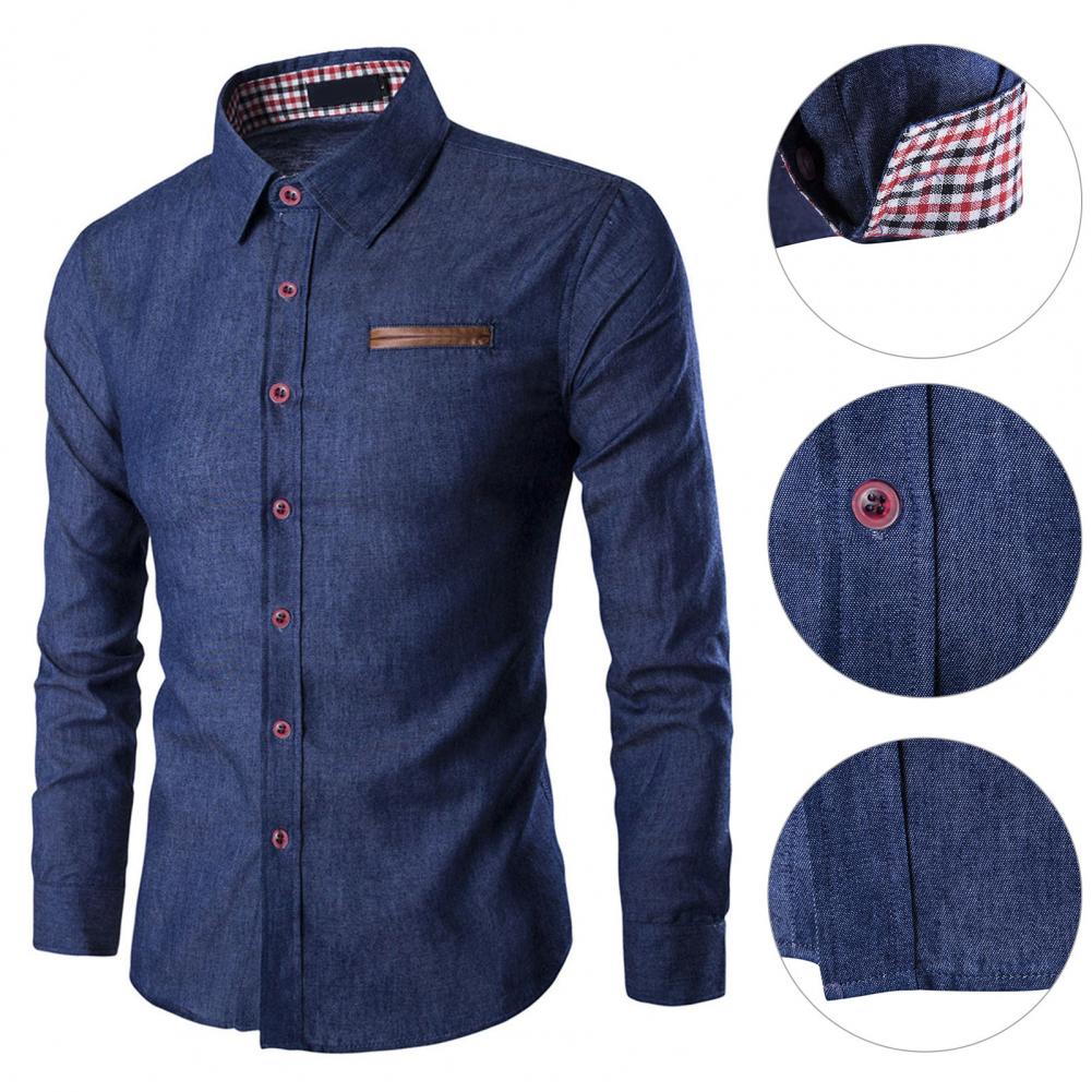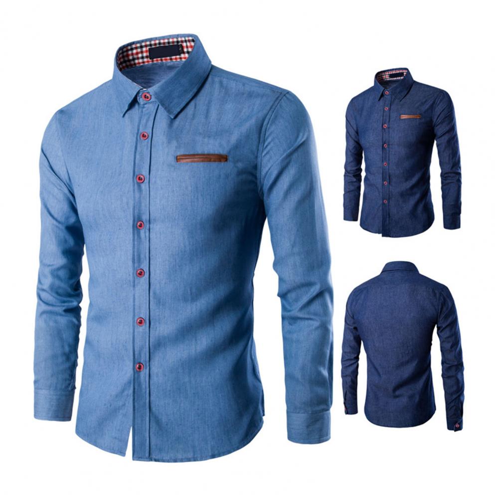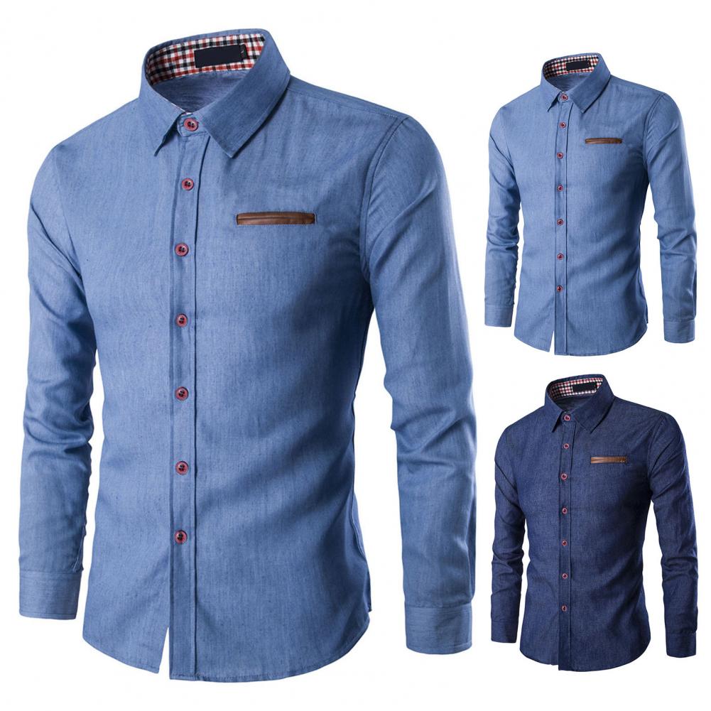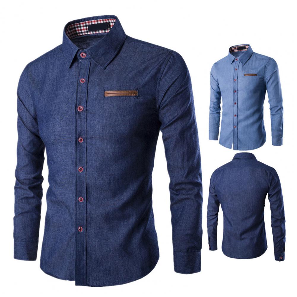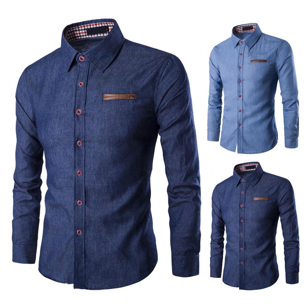 Мужская рубашка однотонная однобортная весенне-осенняя клетчатая Лоскутная Облегающая джинсовая рубашка для офиса